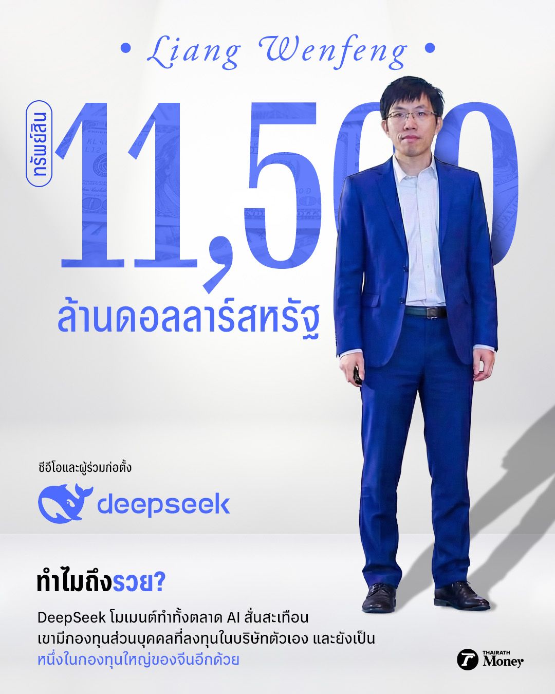 Liang Wenfeng ซีอีโอและผู้ร่วมก่อตั้ง DeepSeek บริษัท AI จากจีน ตามข้อมูลบน Forbes ระบุว่าเขามีทรัพย์สินกว่า 11,500 ล้านดอลลาร์สหรัฐ