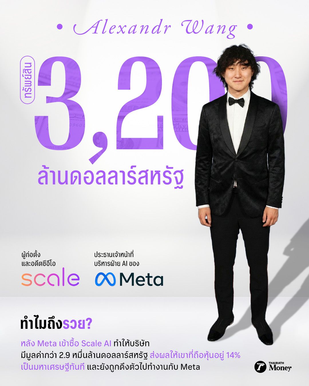 Alexandr Wang ผู้ก่อตั้งและอดีตซีอีโอ Scale AI ที่ปัจจุบันดำรงตำแหน่งประธานเจ้าหน้าที่บริหารด้าน AI ของ Meta ชายที่ขึ้นแท่นเป็นมหาเศรษฐีสร้างตัวที่อายุน้อยที่สุดในโลก โดยเขามีทรัพย์สินรวมอยู่ที่กว่า 3,200 ล้านดอลลาร์สหรัฐ