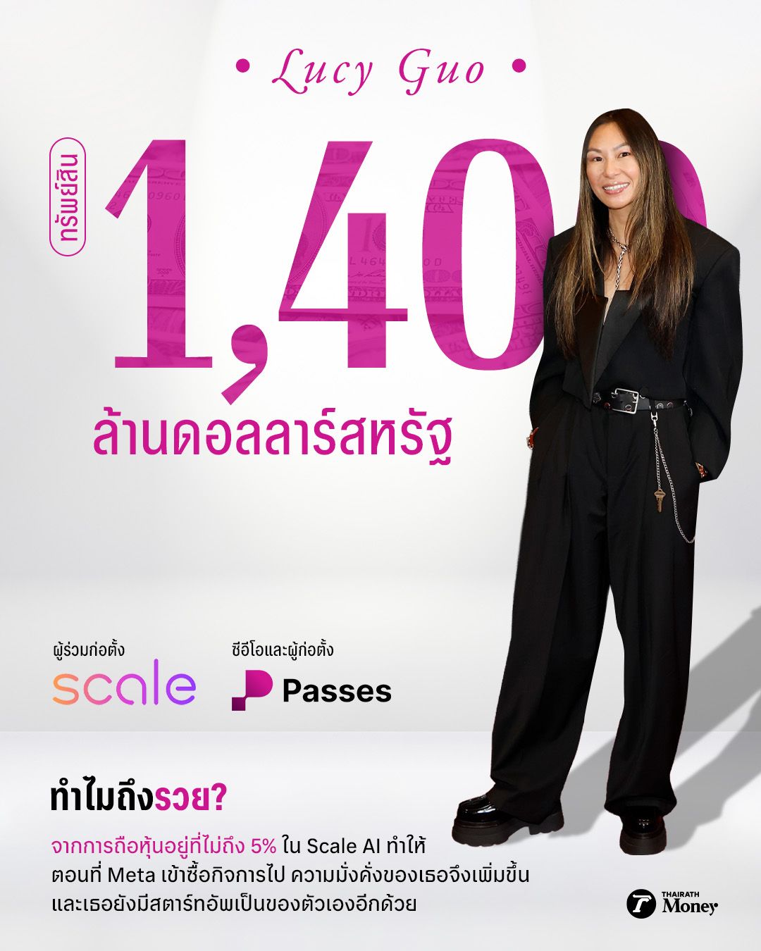 Lucy Guo ผู้ร่วมก่อตั้ง Scale AI และปัจจุบันเป็นซีอีโอและผู้ก่อตั้ง Passes สตาร์ทอัพผู้ให้บริการแพลตฟอร์มสร้างคอนเทนต์หาเงินสำหรับครีเอเตอร์ โดยเธอมีทรัพย์สินรวมกว่า 1,400 ล้านดอลลาร์สหรัฐ