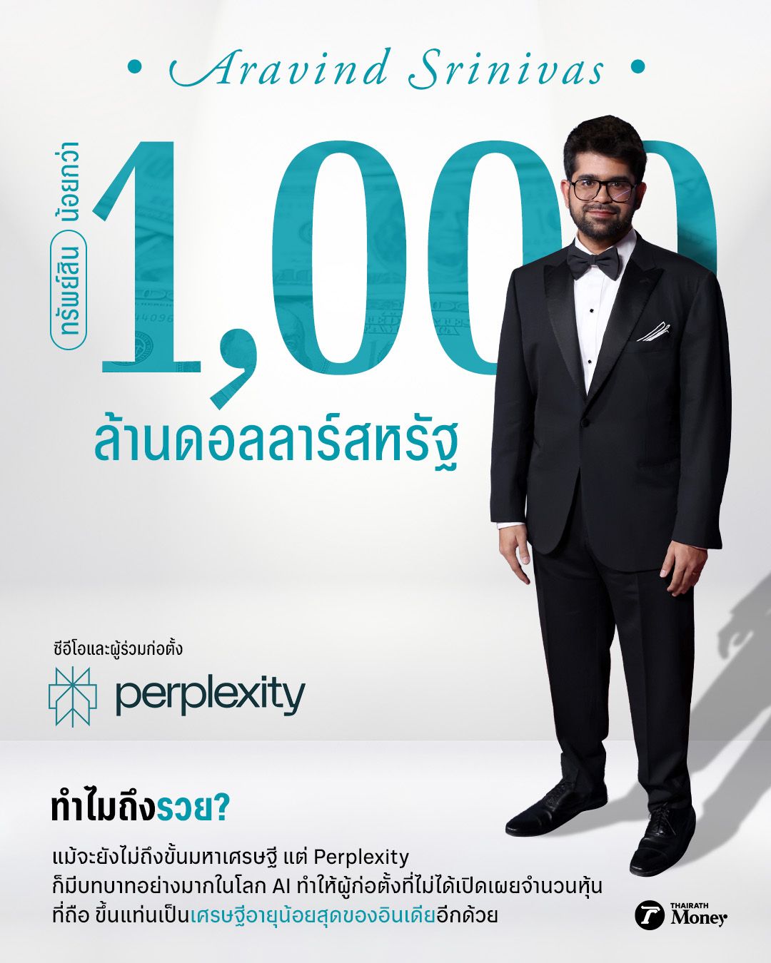 Aravind Srinivas ซีอีโอและผู้ร่วมก่อตั้ง Perplexity บริษัทสตาร์ทอัพด้าน AI และผู้พัฒนาแชตบอตในชื่อเดียวกับบริษัท Perplexity AI ปัจจุบันแม้เขาจะยังไม่ติดลิสต์มหาเศรษฐีของ Forbes และมีทรัพย์สินไม่ถึง 1,000 ล้านดอลลาร์สหรัฐ แต่ก็เป็นอีกหนึ่งคนสำคัญของวงการ AI