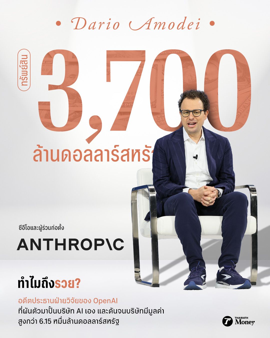 ความมั่งคั่งที่เพิ่มขึ้นของเขา มาจากมูลค่าของบริษัทที่เพิ่มขึ้นไปอยู่ที่กว่า 61,500 ล้านดอลลาร์สหรัฐเมื่อเดือนมีนาคมที่ผ่านมา หลังจับมือเป็นพาร์ทเนอร์กับบิ๊กเทคอย่าง Alphabet บริษัทแม่ของ Google และ Amazon (ปัจจุบัน Anthropic ยังคงเป็นบริษัทที่ไม่ได้เข้าตลาดหลักทรัพย์)