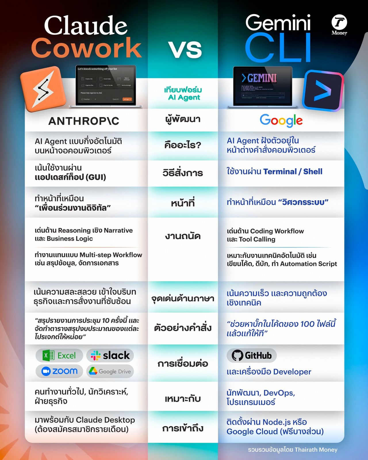 Thairath Money ได้รวบรวมข้อมูลและเทียบฟอร์มของสอง AI Agents ที่กำลังเป็นที่นิยมและกำลังถูกพูดถึงอย่างมาก อย่าง Claude Cowork และ Gemini CLI ว่าทั้งสองมีฟีเจอร์ รูปแบบการทำงาน มีจุดเด่นอะไรบ้าง และเหมาะสมกับใคร