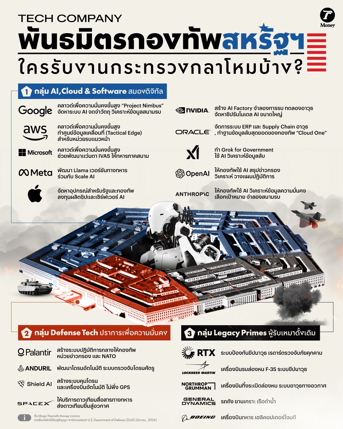 สิ่งที่ชัดเจน คือ สงครามยุคใหม่ไม่ได้ขับเคลื่อนด้วยอาวุธ หรือมีแค่เครื่องบินรบ รถถัง และขีปนาวุธอีกต่อไป โมเดล AI อัลกอริทึม และ คลาวด์ กลายเป็นโครงสร้างพื้นฐานสำคัญของการตัดสินใจทางทหารยุคใหม่ และเบื้องหลังระบบเหล่านี้ คือ เครือข่ายบริษัทเทคโนโลยีที่กลายเป็นพันธมิตรหลักของเพนตากอนอย่างเต็มตัว