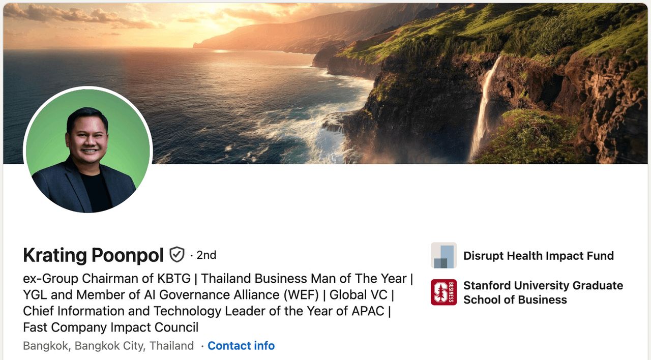 และล่าสุดในเดือนเมษายนนี้ เขายังได้นั่งตำแหน่งประธานของ Disrupt Health Impact Fund กองทุน VC ระยะเริ่มต้น ที่มุ่งเน้นการลงทุนในสตาร์ทอัพด้านเทคโนโลยีสุขภาพระดับโลก (HealthTech) อีกด้วย