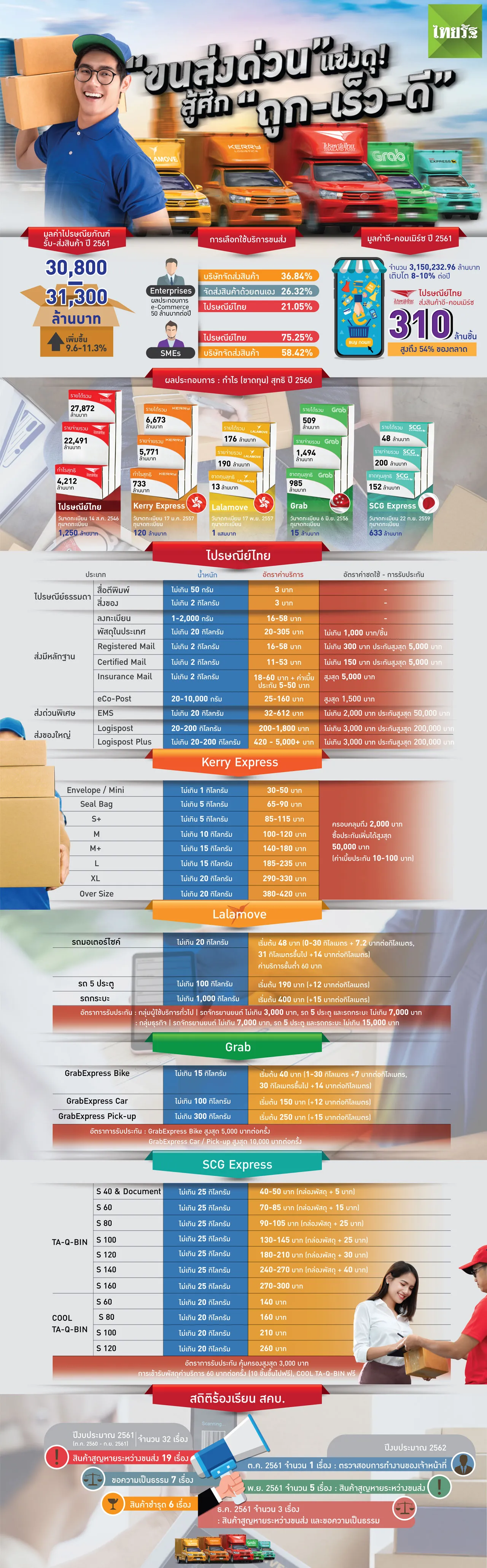 ภาพจำ "บุรุษไปรษณีย์ไทย" ขับขี่มอเตอร์ไซค์ส่งพัสดุ-จดหมายตามบ้านในสมัยก่อน เมื่อมาอยู่ในยุคดิจิทัล 4.0 นี้ ไม่ได้มีเพียงแค่ "ไปรษณีย์ไทย" เท่านั้น ด้วยการเปลี่ยนแปลงของสังคมและการเติบโตของธุรกิจอี-คอมเมิร์ซ ที่แค่นอนอยู่บ้านก็กดสั่งซื้อสินค้าให้มาส่งถึงที่ได้แล้ว ทำให้ก่อกำเนิดการแข่งขันอันดุเดือดของ "ธุรกิจขนส่ง-โลจิสติกส์" หรือที่เรียกกันง่าย ๆ ว่า "ขนส่งด่วน"