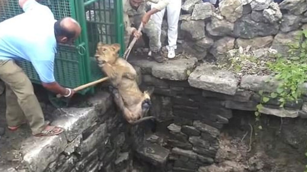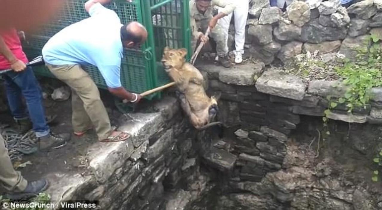 สำนักข่าวต่างประเทศ เผยแพร่คลิปลูกสิงโตน้อยอายุ 2 ปี ถึงคราวหมดท่าพญาราชสีห์ เมื่อดันกระโดดพลาดจนตกลงไปในบ่อน้ำลึก 24 เมตร ที่มีระดับน้ำอยู่ภายในสูงถึงกว่า 6 เมตร หลังจากถูกชาวบ้านในรัฐคุชราต ประเทศอินเดีย พยายามขับไล่มันออกไปพร้อมๆ กับพี่น้องของมันอีก 4 ตัว เมื่อวันที่ 9 ก.ค.ที่ผ่านมา
