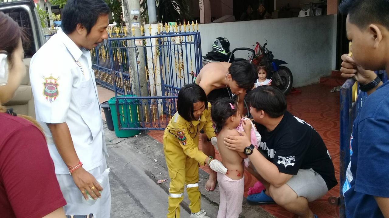 เวลาล้างแผล พ่อสอนอย่างไร? น้องพลอยทำท่าทางสาธิต “ก่อนทำก็ใส่ถุงมือ ไม่ให้เลือดหรือเชื้อโรคเข้าตัว แล้วเช็ดล้างทำความสะอาดแผลด้วยน้ำเกลือ เอาผ้าก๊อซมาปิดแผล แล้วก็เอาเทปใสแปะติดค่ะ”