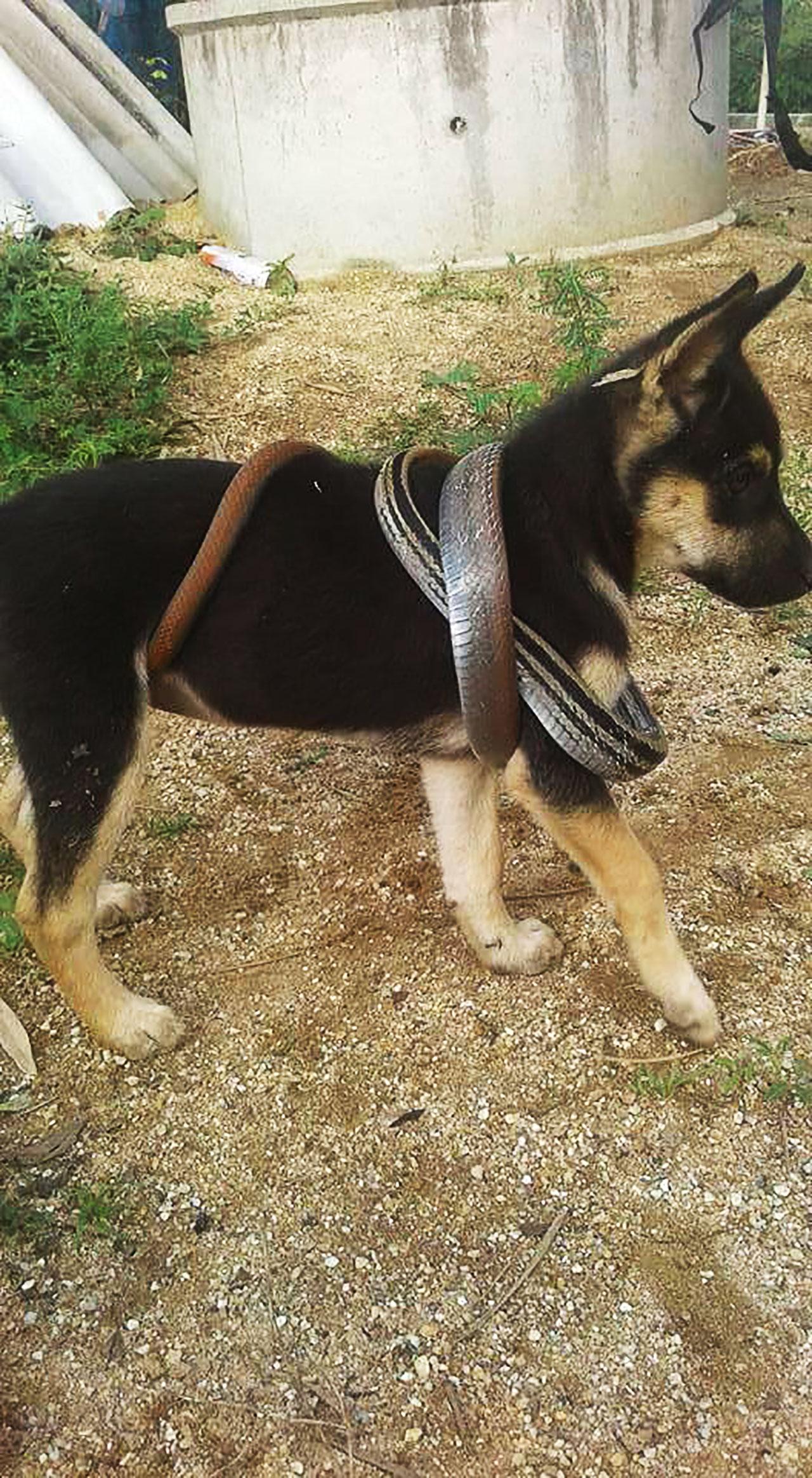 ขณะถางหญ้าได้ยินเสียงเห่ากลางดงหญ้า ตนไม่ได้คิดว่าเกิดเหตุร้ายอะไร คิดเพียงว่าเห่าเล่น สักพักเสียงเห่าเงียบไปครึ่งชั่วโมง ตนร้องเรียกหาก็เงียบ จึงดับเครื่องตัดหญ้าแล้วเดินไปหา เห็นหมาวิ่งออกมาโดยมีงูพันตัวติดมาด้วย