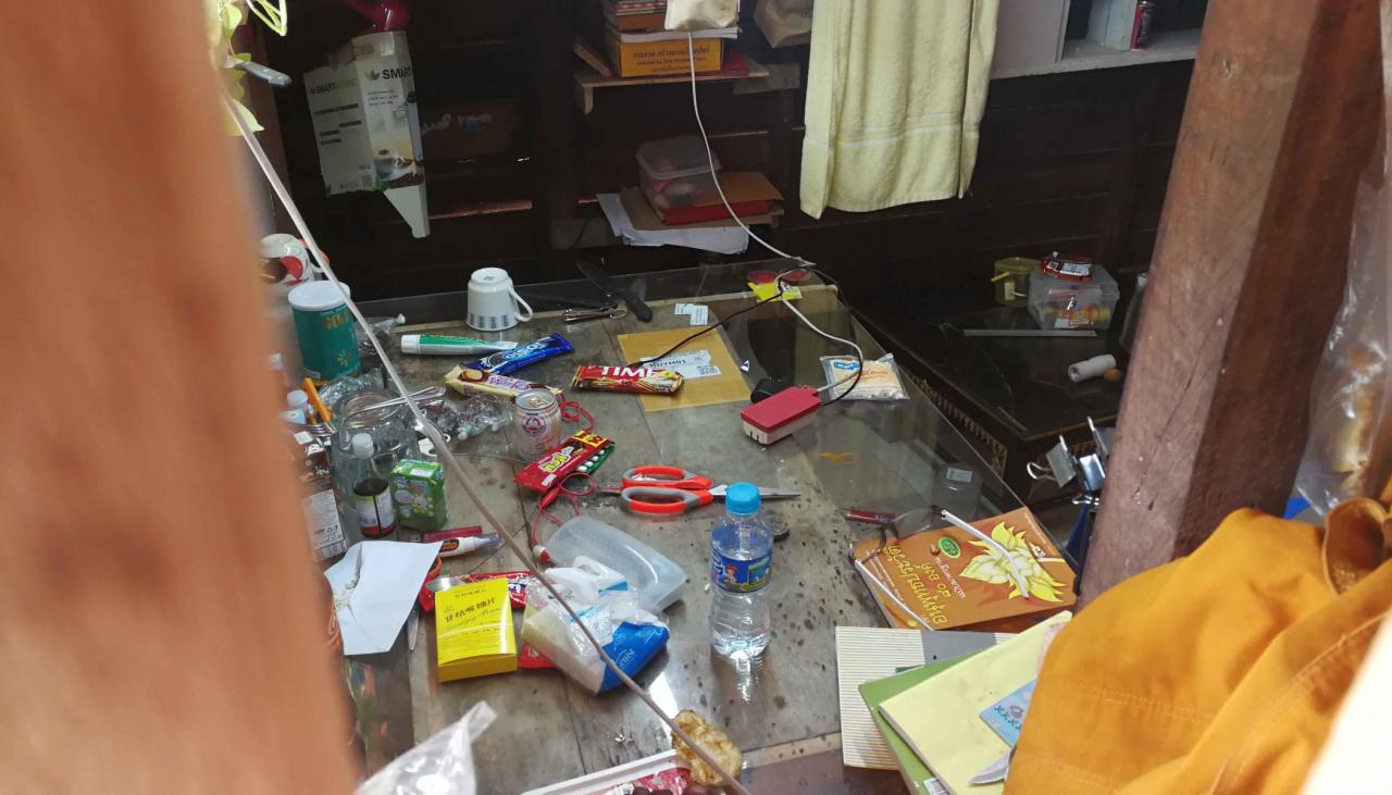 ช่วงเกิดเหตุ พระธรรมณุ ขึ้นไปสวดมนต์เพียง 15 นาที พอกลับมาก็พบว่ากุฏิถูกงัด และครั้งนี้เป็นครั้งที่ 4 ที่โดนคนร้ายงัดกุฏิ นอกจากนี้กุฏิภายในวัดอีก 3 หลัง ที่ตั้งอยู่ติดกันก็โดนงัดมาหมดแล้ว เนื่องจากกุฏิตั้งอยู่ติดริมกำแพงและประตูหลังวัดก็สามารถเข้าออกได้ตลอดเวลา ซึ่งพระสงฆ์ต่างเดือดร้อนและเอือมระอา ตำรวจยังจับคนร้ายไม่ได้ อย่างไรก็ตามพอทราบเบาะแสของคนร้ายแล้วโดยเป็นชายที่มากับหญิงคนหนึ่งที่นำอาหารมาให้สุนัขเป็นประจำซึ่งตำรวจกำลังตามตัวมาสอบสวน