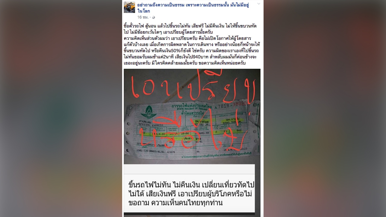 เมื่อวันที่ 15 ส.ค.60 ผู้สื่อข่าวรายงานว่า ตอนนี้เริ่มมีเสียงวิพากษ์วิจารณ์อย่างกว้างขวาง กรณี ผู้ใช้เฟซบุ๊ก “อย่าถามเรื่องความเป็นธรรม เพราะความเป็นธรรมนั้นมันไม่มีอยู่บนโลก” โดยโพสต์ภาพตั๋วรถไฟ พร้อมระบุข้อความว่า