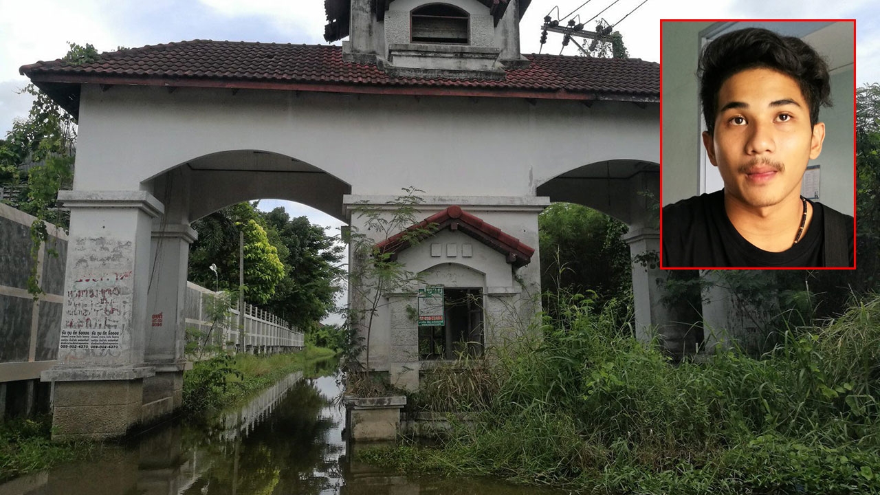 สภาพซุ้มประตูทางเข้าออกหมู่บ้านร้างแห่งหนึ่ง ย่านถนน ทวีวัฒนา-กาญจนาภิเษก มีน้ำท่วมขังหญ้าขึ้นรกชัฏดูน่ากลัวรํ่าลือมีบ้านร้างผีดุ นายนนทวัฒน์ หรือนนท์ บัวธรรม (ภาพเล็ก) พร้อมเพื่อนรวม 6 คน ซิ่งรถ จยย.ไปดู ผ่านมาเกือบ 2 ปี มีเพื่อนเสียชีวิตแล้ว 5 ศพ ตัวเองอยู่อย่างหวาดผวาต้องตระเวนทำบุญเชื่อว่าไปลบหลู่.