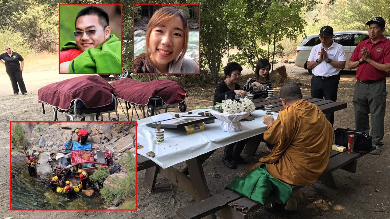 นางสุพิน ชัยรัตนทรงพร แม่ของน้องกอล์ฟ-ภคพลและ น.ส.ทิวารัตน์ แสงสุริยฤทธิ์ พี่สาว น้องมิน-ทิวาดี ร่วมกันประกอบพิธีทางศาสนา หลังเจ้าหน้าที่กู้ภัยเมืองเฟรสโน รัฐแคลิฟอร์เนีย นำร่าง 2 นักศึกษา จากก้นเหวอุทยานคิงส์ แคนยอน ขึ้นมาเรียบร้อยแล้ว โดยมีพระครูใบฎีกา บุญทัน ฉปญฺโญ เจ้าอาวาสวัดพรหมจริยการาม มาประกอบพิธี.