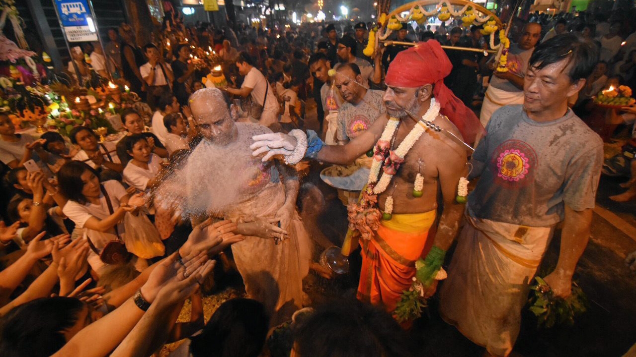 ร่างทรงองค์พระขันทกุมาร (ชุดแดง) เดินโปรยผงศักดิ์สิทธิ์ให้แก่ผู้ที่มาร่วมงาน “นวราตรี 2560” ที่จัดขึ้นในวันวิชัยทัสสมิ หรือวันฉลองชัยชนะของพระแม่ศรีมหาอุมาเทวี ที่วัดพระศรีมหาอุมาเทวี หรือวัดแขกสีลม เมื่อค่ำ 30 ก.ย.