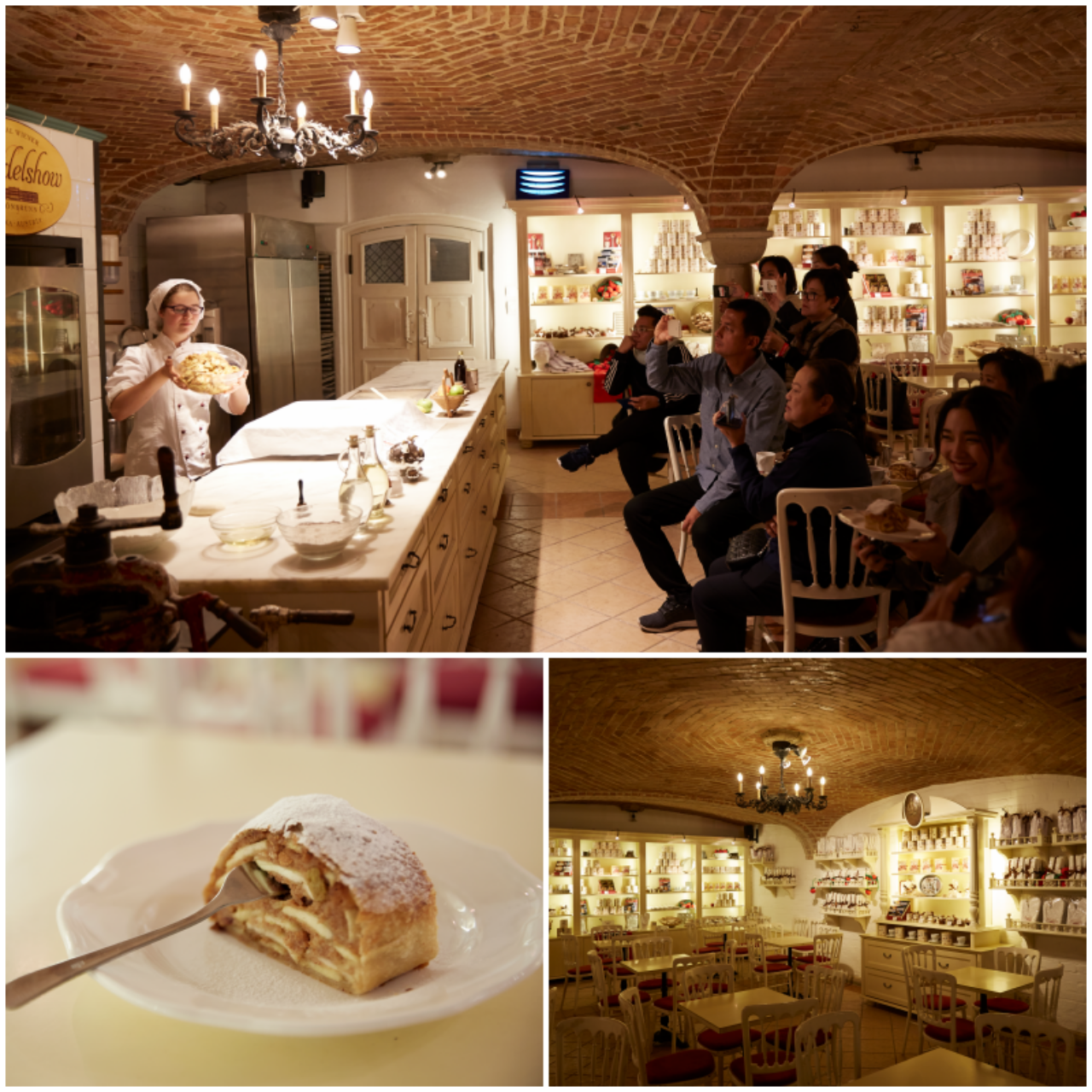 อ่อ และหากเดินชมความงามของอัญมณีแห่งเวียนนา อย่าง พระราชวังเชินบรุนน์ จนเหนื่อยและอยากจะเติมพลังกันสักนิด ขอแนะนำ ร้าน Wiener strudel show ร้านคาเฟ่เล็กๆ ที่แฝงตัวอยู่ในพื้นที่พระราชวัง ร้านนี้มีจุดเด่นคือ ตกแต่งร้านได้น่ารักน่าชัง มีกาแฟและชารสเลิศล้ำ แต่หมัดเด็ดจริงๆ อยู่ที่ แอบเปิ้ลสตรูเดิร์ล (Apple strudel) ซึ่งทางร้านจะมีการโชว์สาธิตวิธีการทำ ให้นักท่องเที่ยวได้ชมกันด้วย หากใครเหนื่อยๆ แวะไปลองลิ้มกันได้เลย