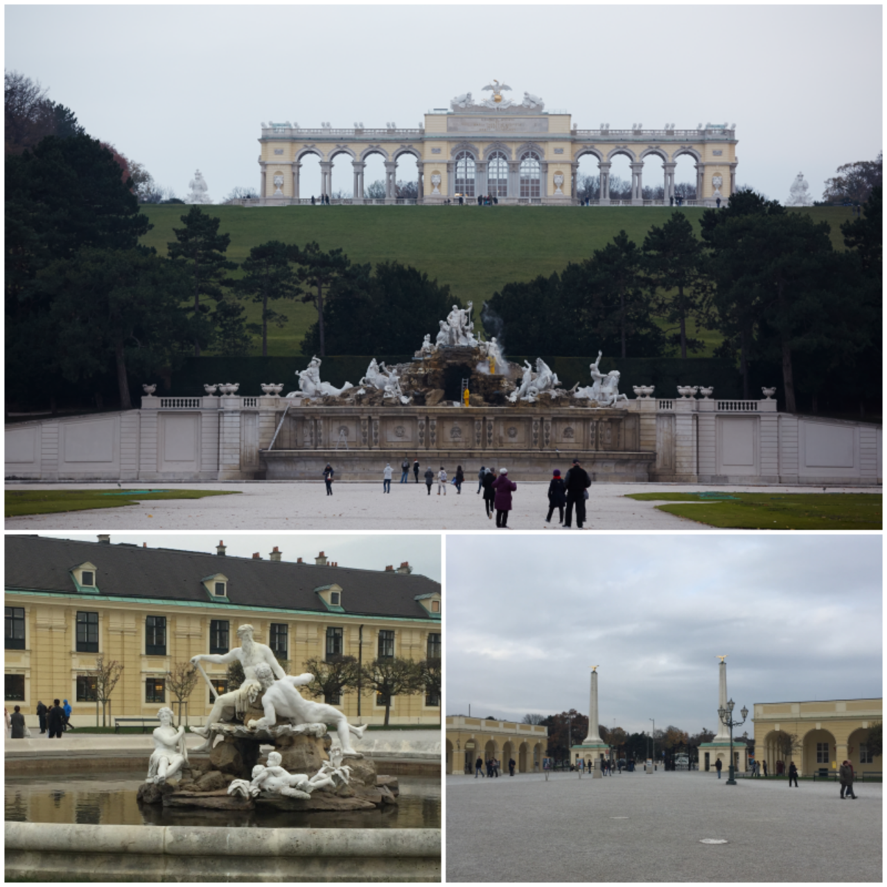 ขณะที่ ตัวพระราชวังขนาดยักษ์ ที่ทาด้วยสีเหลืองทองงามอร่าม นั้น ส่วนตัวบอกได้เลยว่า ไม่ว่าใครมาเห็น เป็นต้องรัวยิงชัตเตอร์ถี่ยิบเพื่อเก็บภาพไว้เป็นที่ระลึกแน่นอน แต่ขอเตือนก่อนว่า อย่ารัวชัตเตอร์เพลิน จนลืมเหลือเมมโมรี่ ไว้สำหรับถ่ายภาพด้านหลังปราสาทที่งดงามและโออ่าไม่แพ้กัน หนำซ้ำยังมีไฮไลต์สำคัญอีกจุดอยู่ คือ สวนขนาดยักษ์ที่เต็มไปด้วยรูปปั้นตามศิลปะเทพกรีกและโรมันจำนวนมาก และทางเดินเขาวงกต ขึ้นไปสู่โกลเรียตต์ (Gloriette) ประตูชัย สัญลักษณ์แห่งชัยชนะของออสเตรีย ในสงครามกับรัสเซีย เมื่อปี ค.ศ.1757 ซึ่ง ณ จุดนี้ เมื่อมองลงมา จะเป็นวิวร้อยล้าน ที่เห็นพระราชวังเชินบรุนน์ ได้งดงามยิ่งนัก เป็นจุดถ่ายรูปที่ห้ามพลาดด้วยประการทั้งปวง!