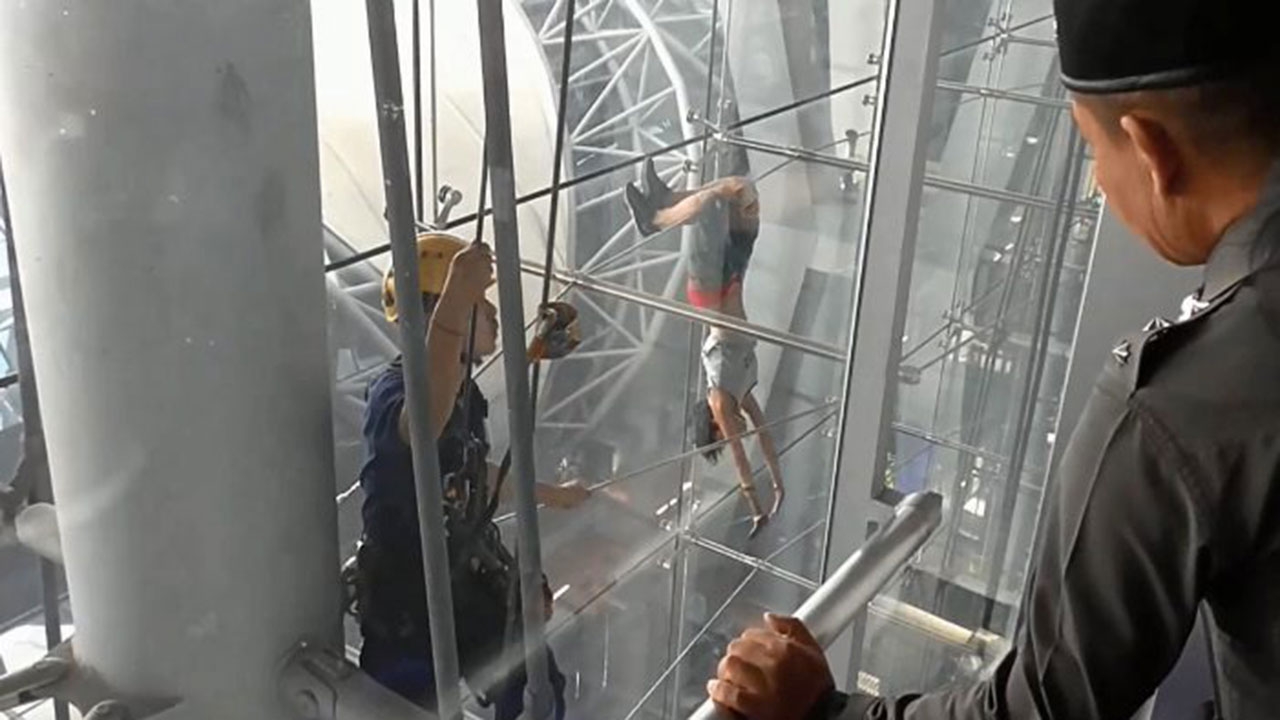สาวลักษณะเหมือนยุโรปตัดผมสั้นคล้ายทอม อายุ 20-30 ปี ใช้ขาสองข้างเกี่ยวสลิงยึดโครงอาคารผู้โดยสารขาออกท่าอากาศยานสุวรรณภูมิ จ.สมุทรปราการ ตรงจุดชมวิวเครื่องบินที่มีความสูง 20 เมตร เป็นที่น่าหวาดเสียว ก่อนสาวต่างชาติคนดังกล่าวจะหมดแรงตกลงไปบนเบาะลมที่เจ้าหน้าที่นำมารองไว้ นำตัวส่ง รพ.สมิติเวชตรวจละเอียด.