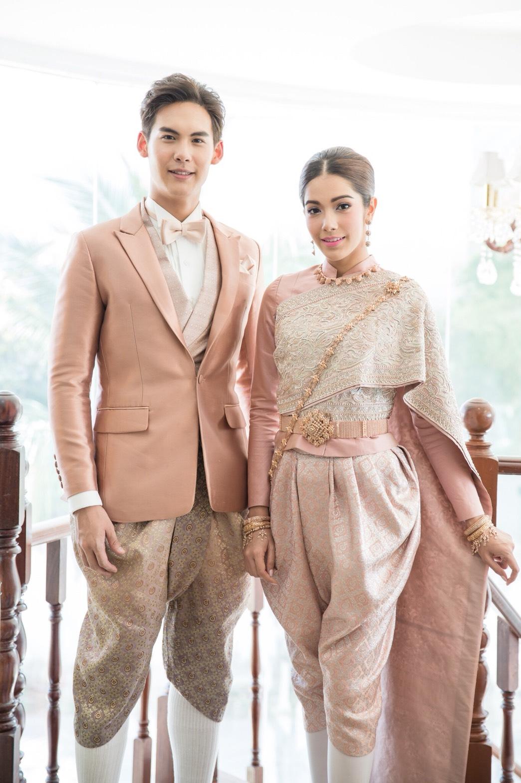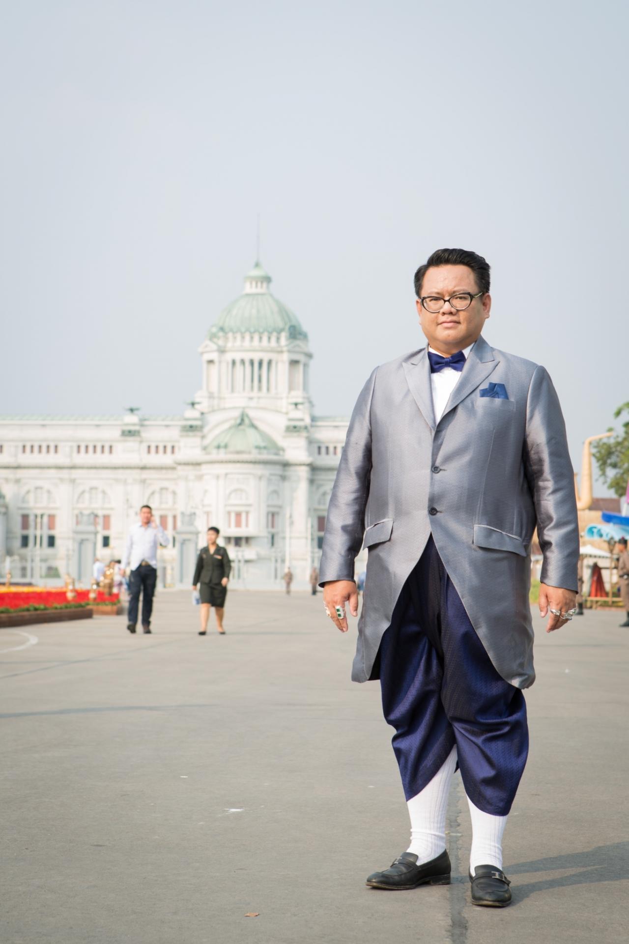 สำหรับชาย สวมชุดสูทไทย นุ่งโจงกระเบน ลวดลายไทย แบบประยุกต์ เป็นผ้าไหมไทยสี่เส้นสีพื้นเนื้อพิเศษ และผ้าไหมไทยทอลายลูกแก้ว ที่สืบทอดจากภูมิปัญญาท้องถิ่นกว่าร้อยปีเป็นผ้าไหมไทยสี่เส้นสีพื้นเนื้อพิเศษ และผ้าไหมไทยทอลายลูกแก้ว ที่สืบทอดจากภูมิปัญญาท้องถิ่นกว่าร้อยปี