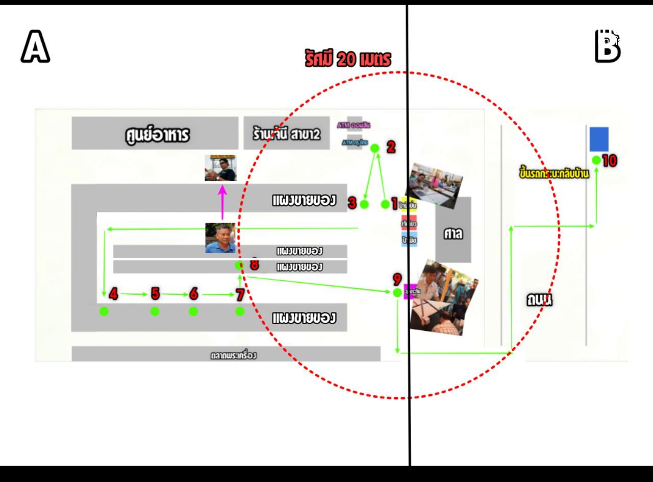 หากนับจากระยะ 20 เมตรจากแผงลอตเตอรี่นั้น ฝั่งที่น่าจะมีความเป็นไปได้มากที่สุดในการที่พยานจะเห็นลุงจรูญถือลอตเตอรี่น่าจะเป็นฝั่งตลาดนัด
