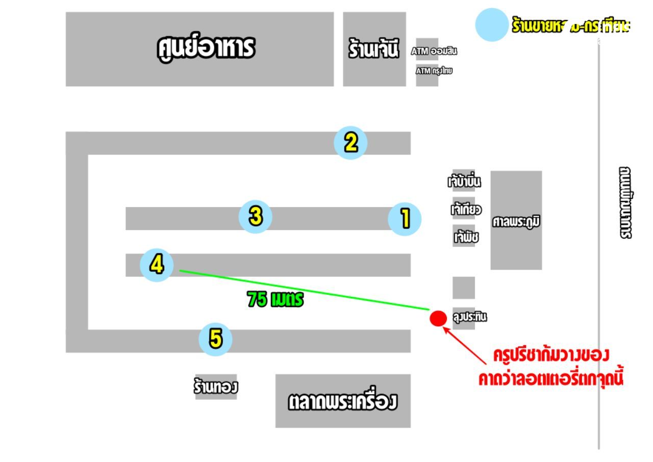 ร้านที่ 4 ตั้งอยู่ห่างจากจุดที่ครูปรีชาคาดว่าทำลอตเตอรี่ตกจากการก้มวางของ ประมาณ 75 เมตร