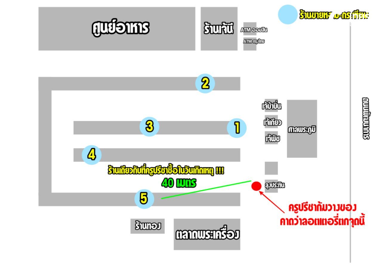 ร้านที่ 1 แผงของแม่ค้าวัยรุ่น ตั้งอยู่ห่างจากจุดที่ครูปรีชาคาดว่าทำลอตเตอรี่ตกจากการก้มวางของ ประมาณ 6-7 เมตร