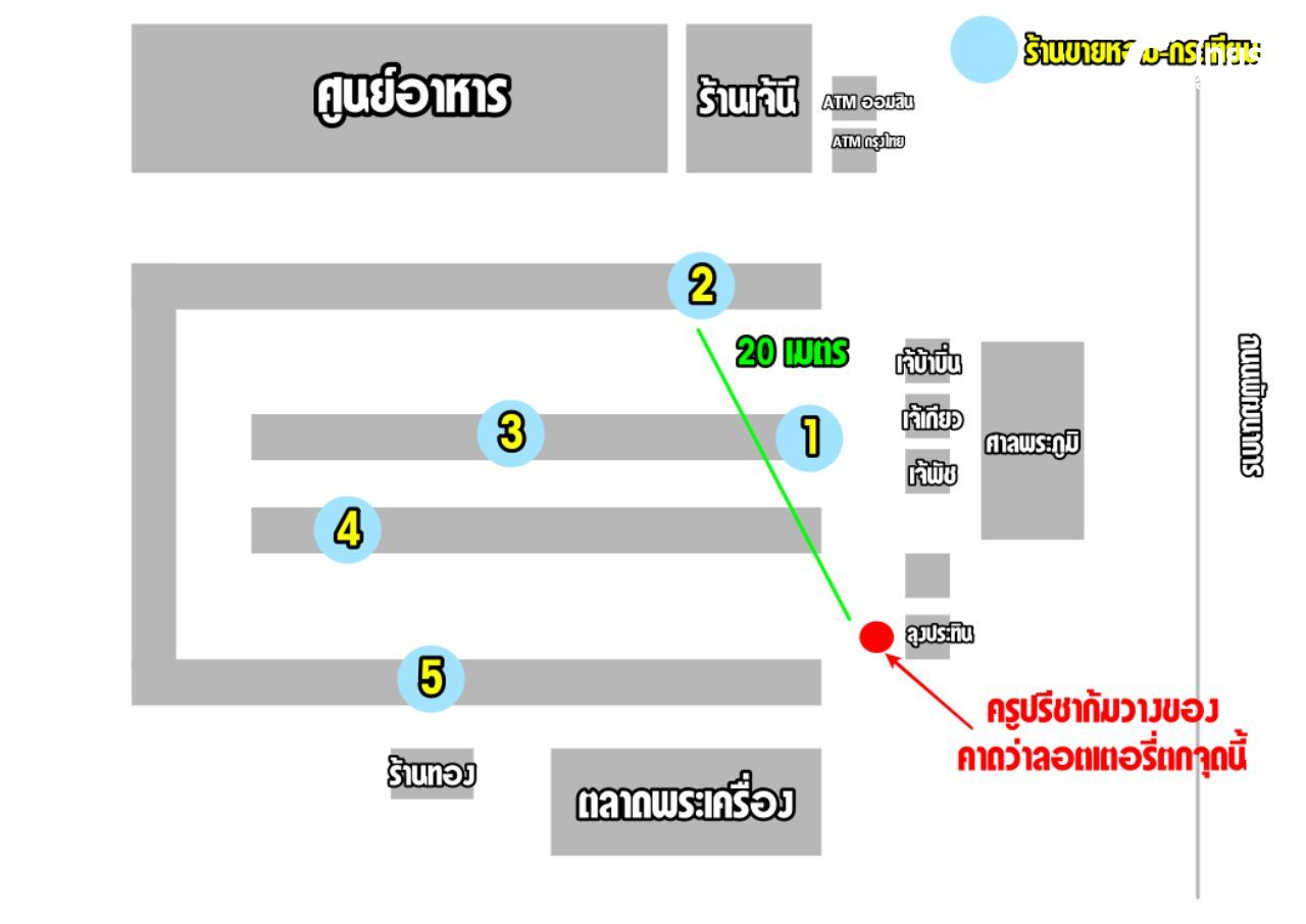 ร้านที่ 2 ตั้งอยู่ห่างจากจุดที่ครูปรีชาคาดว่าทำลอตเตอรี่ตกจากการก้มวางของ ประมาณ 20 เมตร