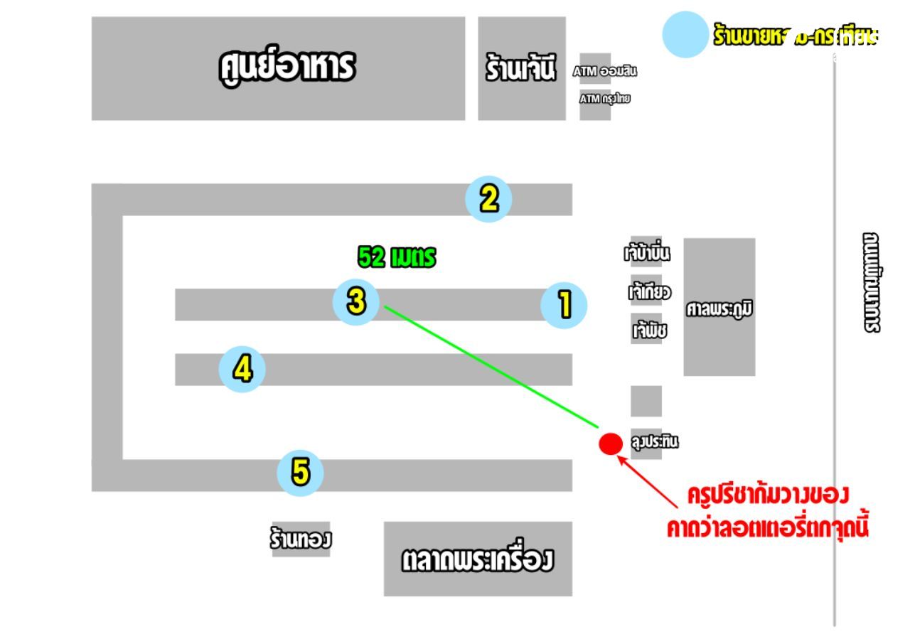 ร้านที่ 3 ตั้งอยู่ห่างจากจุดที่ครูปรีชาคาดว่าทำลอตเตอรี่ตกจากการก้มวางของ ประมาณ 52 เมตร