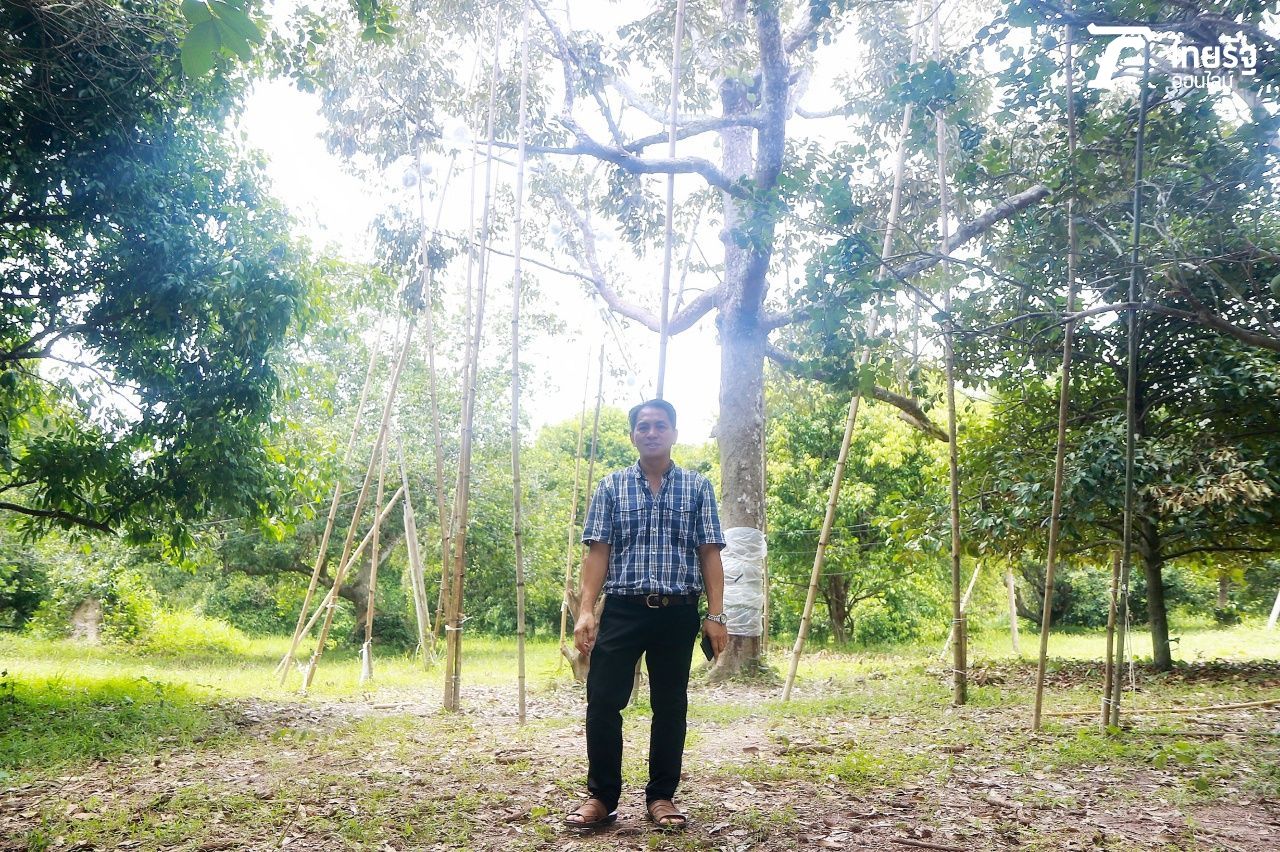 “จะรู้ได้อย่างไรว่า ทุเรียนลูกไหนเหมาะตัดขาย อันดับแรก คือ ผมจดบันทึกช่วงเวลาติดดอกออกผลไว้ อันดับสองปีนขึ้นไปเคาะ โดยใช้นั่งร้าน ต้นนี้ทีแรกออก 300 กว่าผล กะเก็บไว้กินบ้าง ปัจจุบันเหลือประมาณ 80 ผล หายไปเพราะนอกจากกระรอกแล้วก็ยังมีคนเข้ามาขโมย