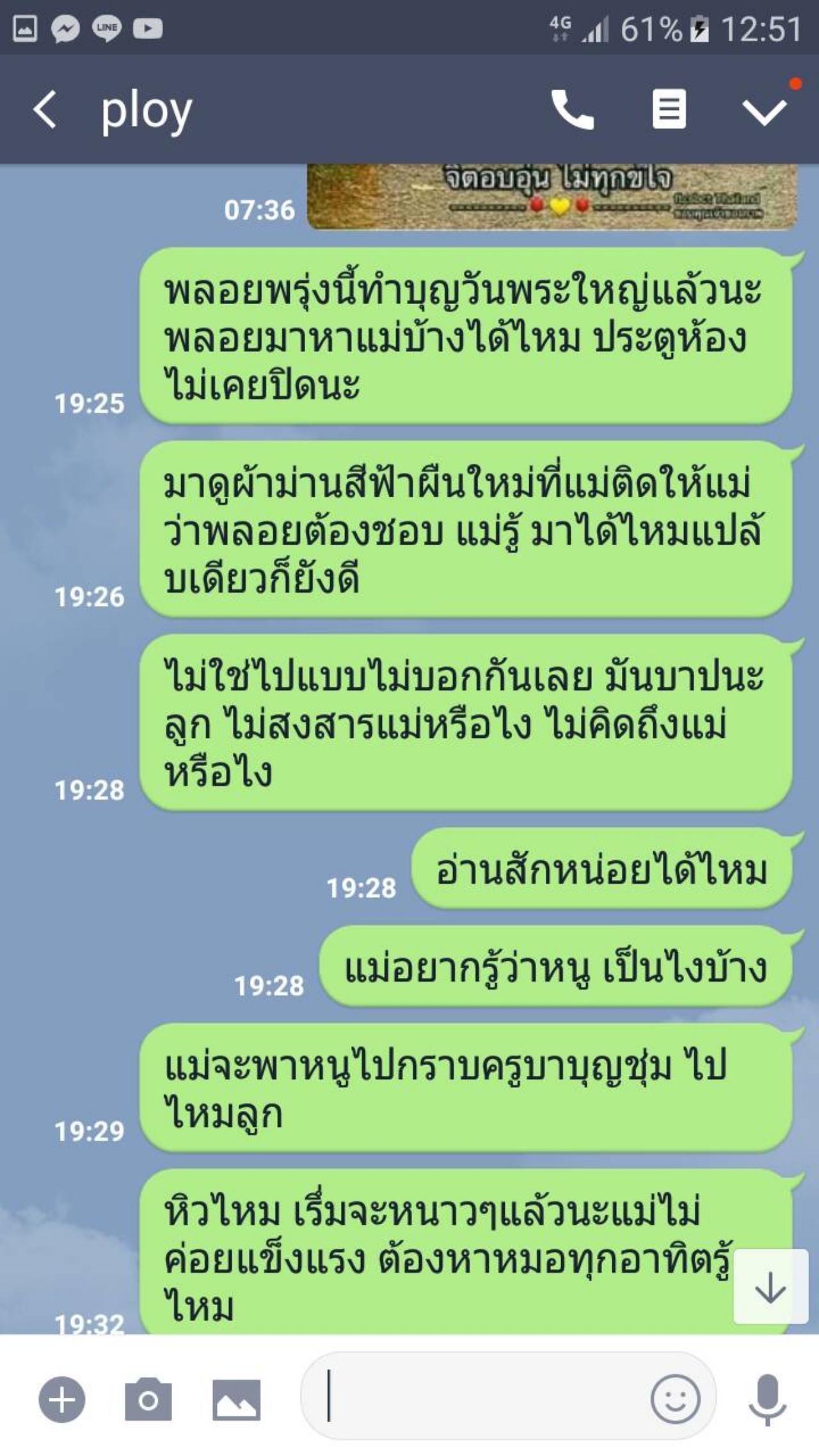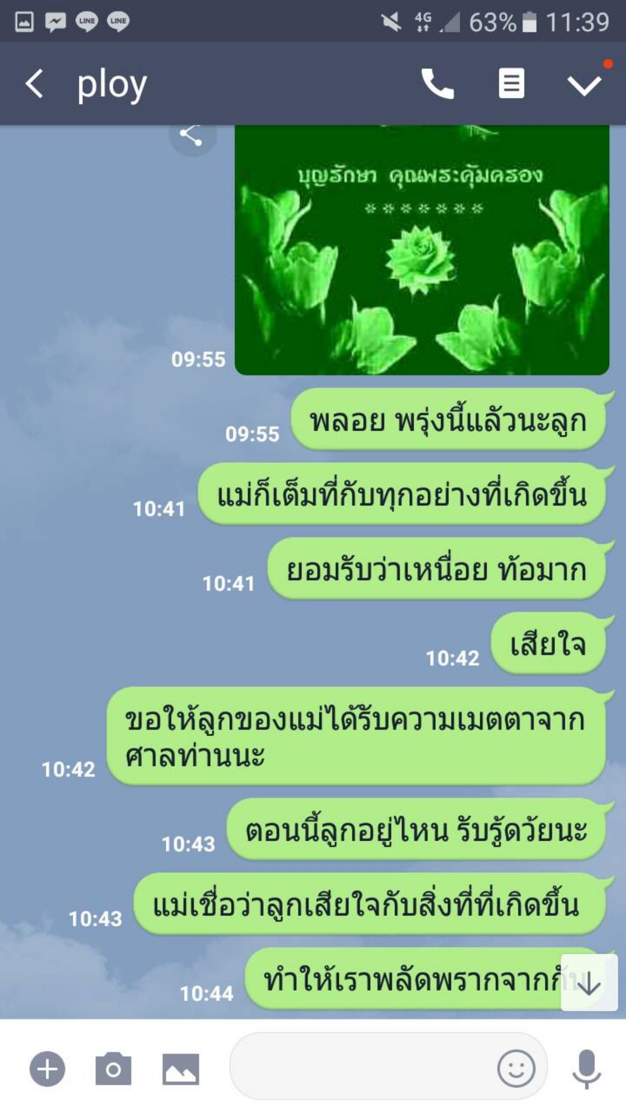 “3 ปี ที่แม่ไม่รู้ว่าน้องพลอยตาย มารู้เมื่อวันแม่ปีที่แล้ว มันเป็นวันแม่ที่ไม่เหมือนคนอื่นจนแม่ตาย มันเป็นเดือนแห่งความเจ็บปวด มันเป็นเดือนแห่งความทุกข์จริงๆ นะ ทุกวันแม่ เราอยู่ด้วยกัน เป็นวันพิเศษหนึ่งที่น้องพลอยจะมีของกุ๊กกิ๊กๆ มาให้
