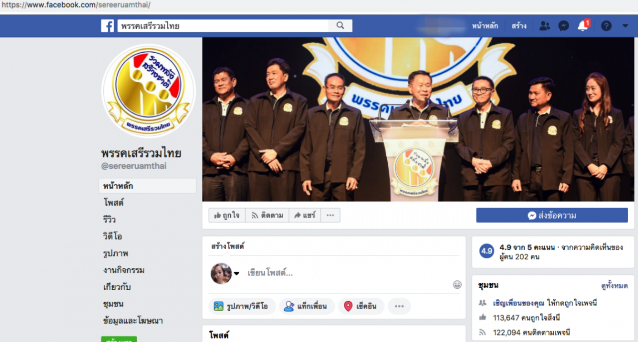 อันดับ 4 พรรคเสรีรวมไทย กดถูกใจ 113,647 คน และ กดติดตามเพจ 122,094 คน