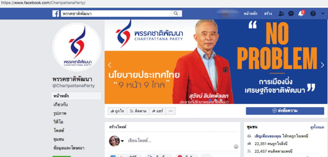 หัวหน้าพรรค กัญจนา ศิลปอาชา ชื่อเพจ พรรคชาติไทยพัฒนา Chartthaipattana Party โดยหน้าปกเพจมีเพียงข้อความ “ก้าวข้าม ความขัดแย้ง ร่วมแรงปฏิรูปประเทศไทย” ส่วนรายละเอียดเกี่ยวกับเพจระบุสั้นๆ “การเมืองไม่ขัดแย้ง สร้างแรงกระตุ้นเศรษฐกิจ มีคุณภาพชีวิตที่ดี”