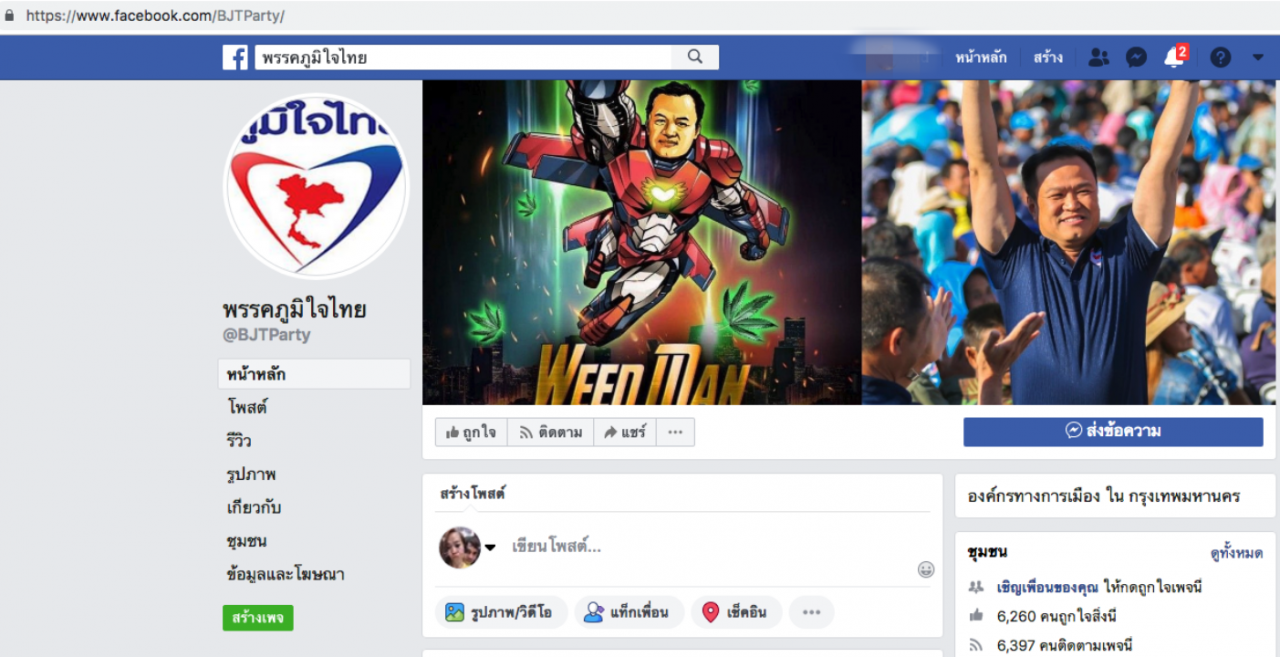 หัวหน้าพรรค อนุทิน ชาญวีรกูล ชื่อเพจ พรรคภูมิใจไทย โดยหน้าปกเพจเป็นเพียงรูป 'อนุทิน' หัวหน้าพรรคที่เป็นภาพจริง และภาพการ์ตูน โดยไม่มีข้อความนโยบายของพรรค เมื่อคลิกเข้าไปดูข้อมูลเกี่ยวกับเพจ ระบุสั้นๆ ไว้ ประชานิยม สังคมเป็นสุข