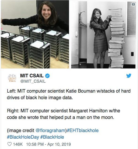 ‘3 ปีที่แล้ว เคที บาวแมน เป็นนักศึกษาที่ MIT เธอเป็นผู้นำในการสร้างอัลกอริทึมใหม่ในการสร้างภาพถ่ายหลุมดำครั้งแรก และวันนี้ ภาพนั้นถูกเผยแพร่ออกมาแล้ว’ คณะวิทยาการคอมพิวเตอร์ และปัญญาประดิษฐ์ ของสถาบัน MIT ทวีตข้อความยกย่องดร.บาวแมน