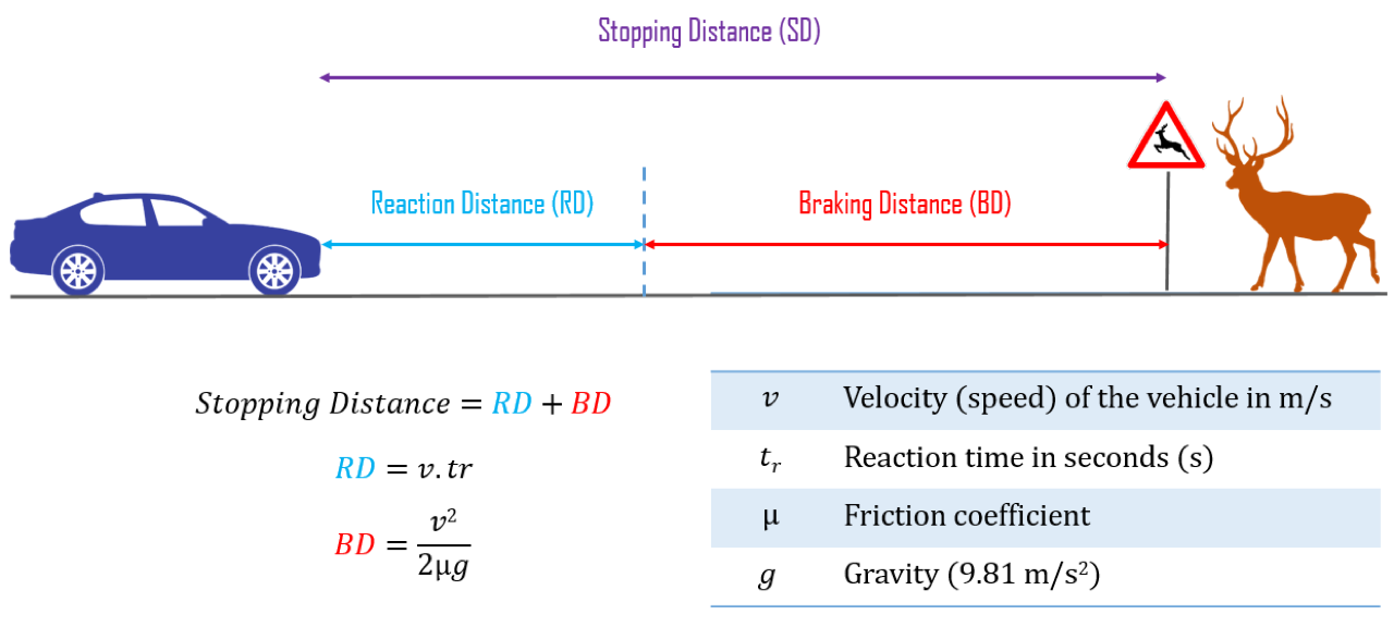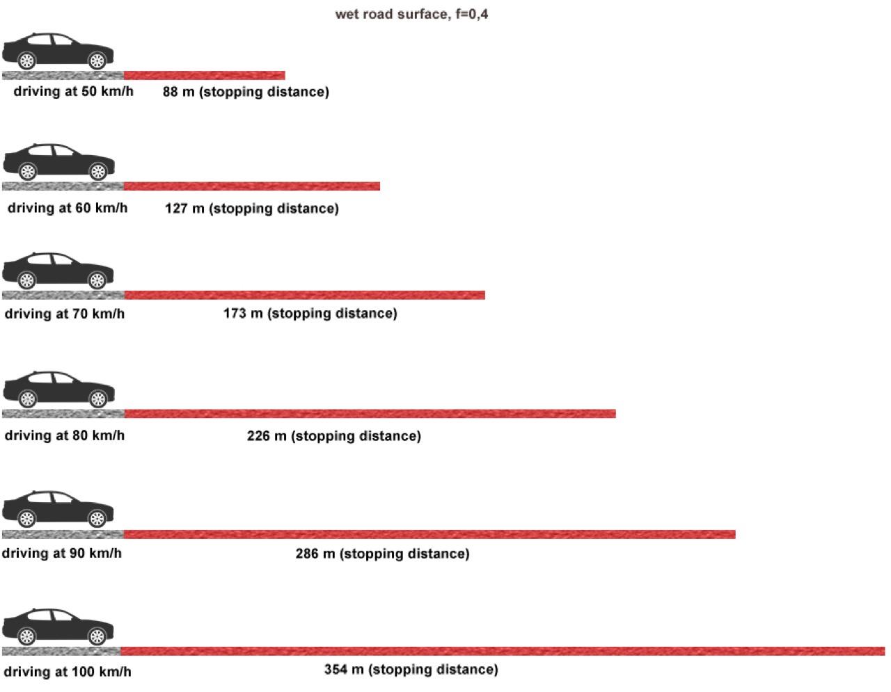 ความเร็ว 100 กิโลเมตรต่อชั่วโมง ระยะรับรู้และตัดสินใจ 2 วินาที เสียระยะเบรกไปแล้ว 20 เมตร ระยะเบรกจนรถหยุด 60 เมตร ระยะทางสำหรับการหยุดรถ 80 เมตร