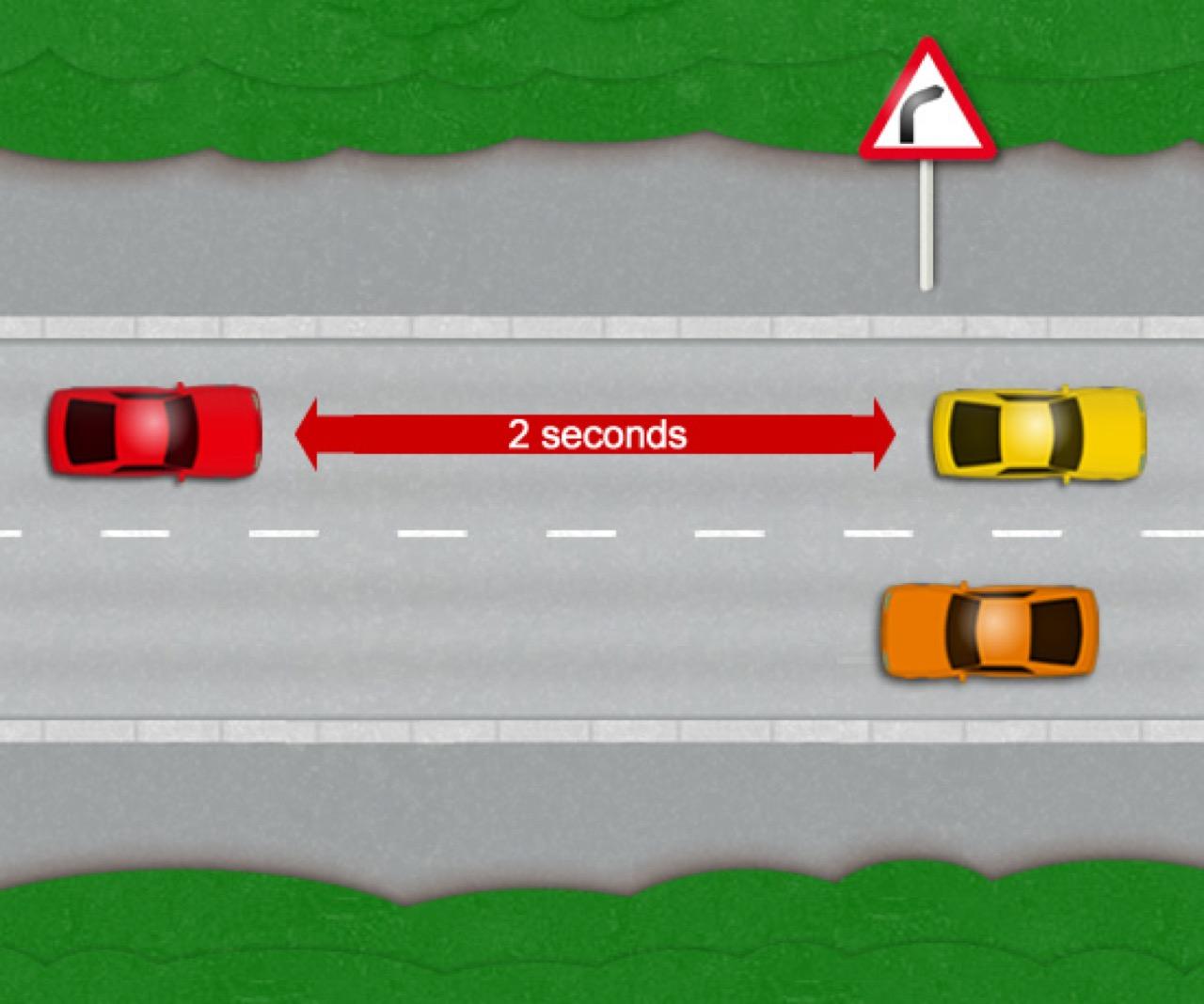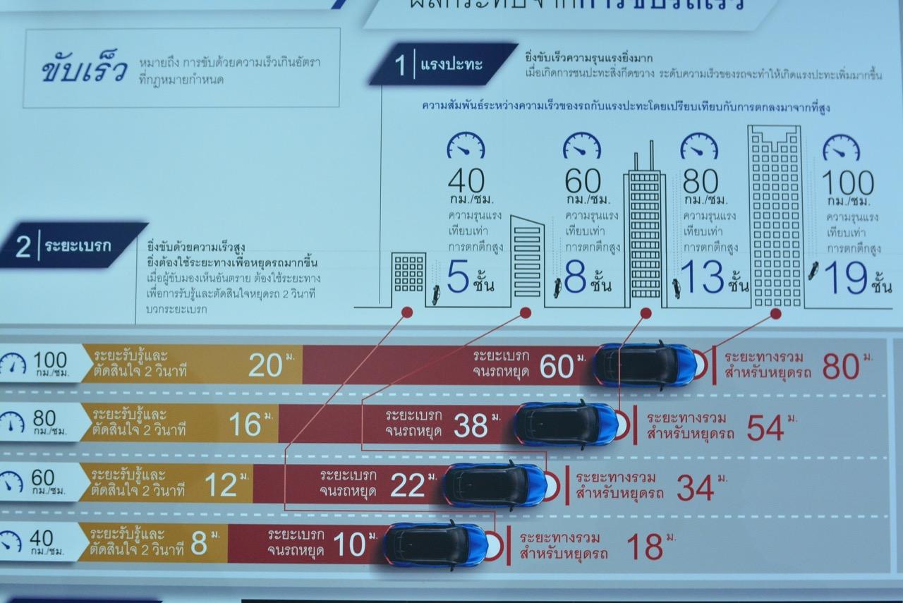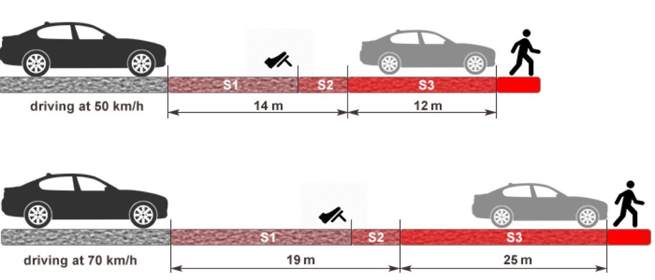 ความเร็ว 60 กิโลเมตรต่อชั่วโมง ระยะรับรู้และตัดสินใจ 2 วินาที เสียระยะเบรกไปแล้ว 12 เมตร ระยะเบรกจนรถหยุด 22 เมตร ระยะทางสำหรับการหยุดรถ 34 เมตร
