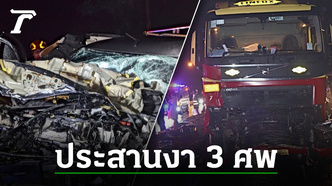 สลด กระบะฝ่าฝน มุ่งหน้าเข้ากรุง แฉลบเสียหลักชนหลักกิโลเมตร พุ่งข้ามเลน-ประสานงา 18 ล้อ บน ถ.มิตรภาพ กระบะพังเป็นซาก ตายยกคัน 3 ศพ