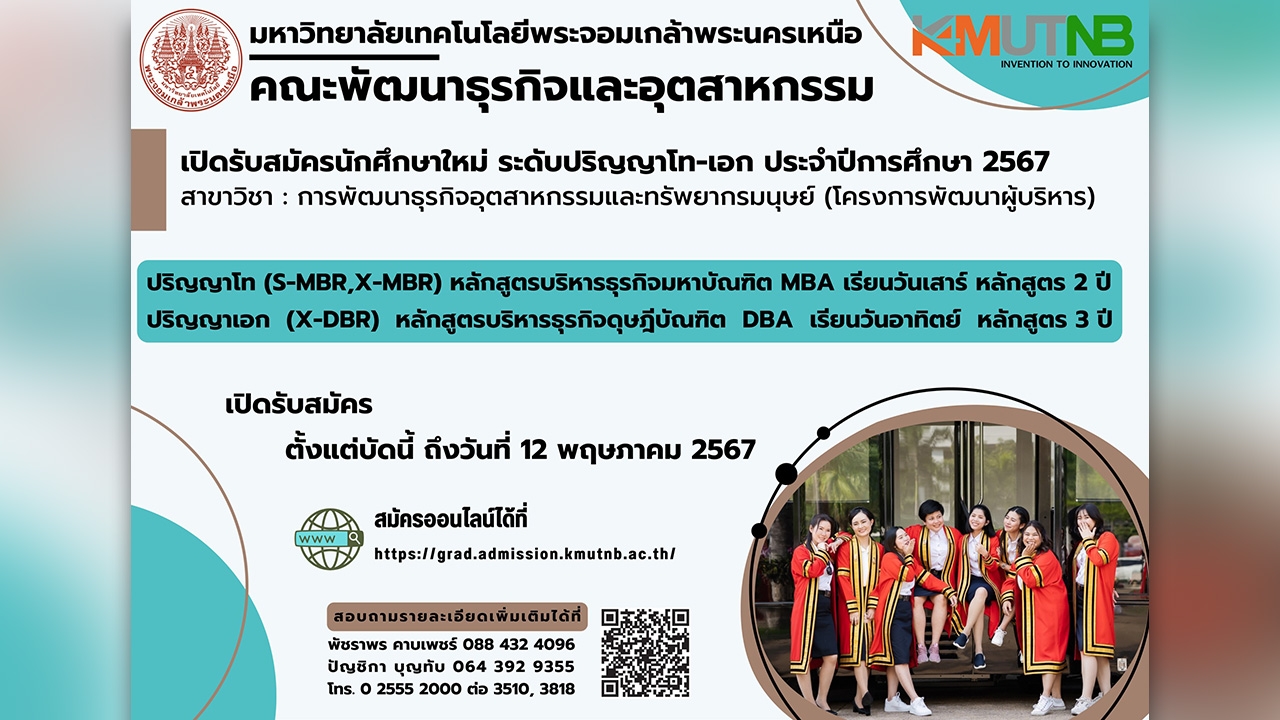 มหาวิทยาลัยเทคโนโลยีพระจอมเกล้าพระนครเหนือ เปิดรับสมัครนักศึกษาใหม่ ประจำปีการศึกษา 2567 ระดับปริญญาโท และปริญญาเอก ใน 2 หลักสูตร ของโครงการพัฒนาผู้บริหารหลักสูตรบริหารธุรกิจระดับบัณฑิตศึกษา คณะพัฒนาธุรกิจและอุตสาหกรรม สาขาวิชาการพัฒนาธุรกิจอุตสาหกรรมและทรัพยากรมนุษย์
