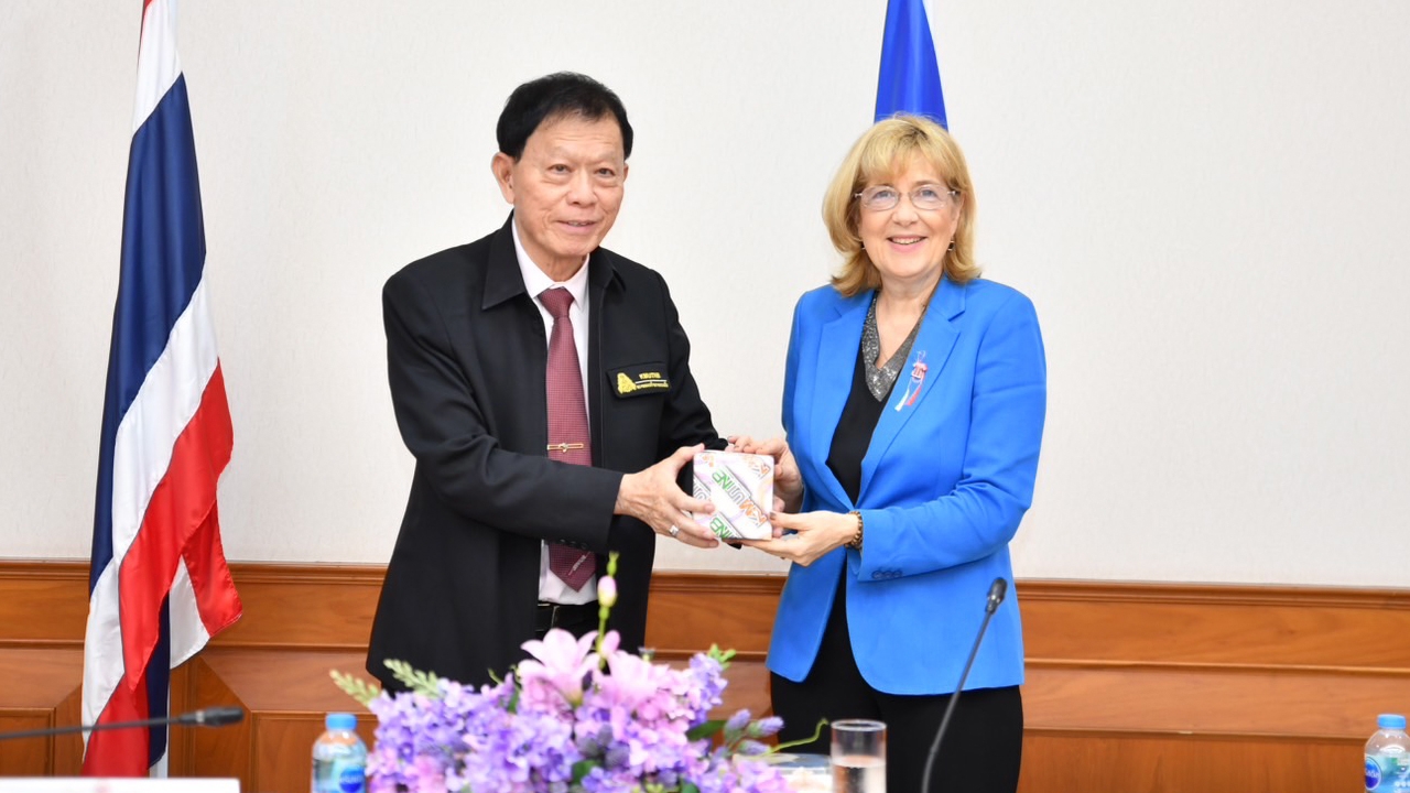 เมื่อวันที่ 10 มีนาคม 2568 วิทยาลัยนานาชาติ มหาวิทยาลัยเทคโนโลยีพระจอมเกล้าพระนครเหนือ จัดโครงการการบรรยายพิเศษในหัวข้อ "Embassy Talk: Insight into Romania’s Trade Landscape and Cultural Heritage" โดยได้รับเกียรติจาก H.E. Mrs. Daniela-Brînduşa Băzăvan เอกอัครราชทูตโรมาเนียประจำประเทศไทย มาร่วมเป็นวิทยากรในการบรรยาย มี ศ.ดร. ธีรวุฒิ บุณยโสภณ นายกสภามหาวิทยาลัยฯ พร้อมด้วย ศ.ดร. เสาวณิต สุขภารังษี รองอธิการบดีฝ่ายวิชาการ, รศ.ดร. พิเชษฐ์ ศรียรรยงค์ รองอธิการบดีฝ่ายสารสนเทศ, ผศ.ดร. อัจฉรียา รอบกิจ คณบดีวิทยาลัยนานาชาติ, รศ.ดร. เพียรพูล กมลจิตร์ประภา คณบดีคณะวิทยาศาสตร์ประยุกต์ และคณะผู้บริหารให้การต้อนรับ พร้อมทั้งประชุมเพื่อหารือความร่วมมือทางวิชาการ และมอบทุนการศึกษาสำหรับนักศึกษาชาวโรมาเนีย จำนวน 2 ทุน ในสาขาวิชาการค้าระหว่างประเทศและธุรกิจโลจิสติกส์ วิทยาลัยนานาชาติ ณ ชั้น 9 อาคารนวมินทรราชินี