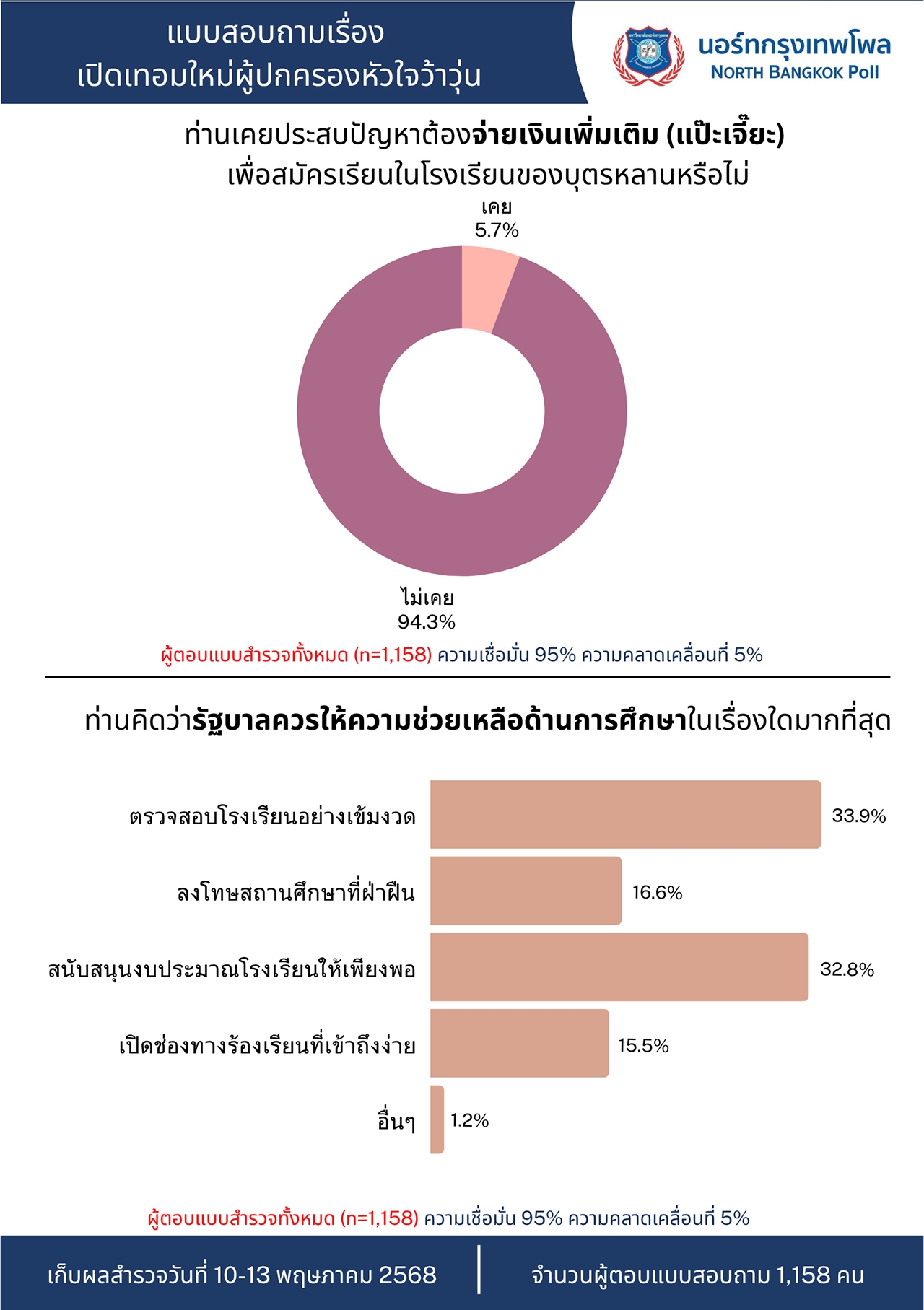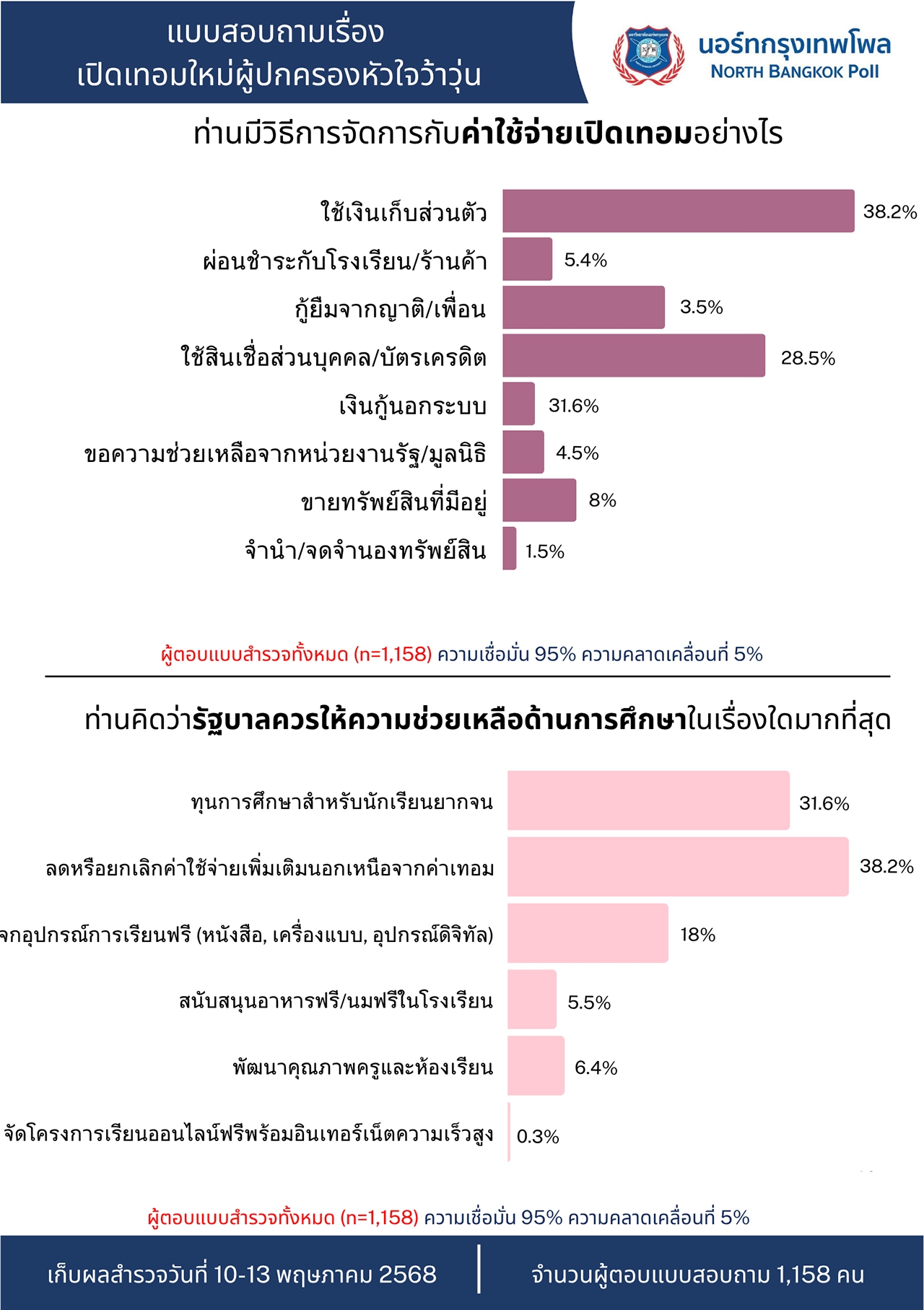 ท่านคิดว่ารัฐบาลควรให้ความช่วยเหลือด้านการศึกษาในเรื่องใดมากที่สุด พบว่าความช่วยเหลือที่อยากให้รัฐบาลช่วยมากที่สุดคือลดหรือยกเลิกค่าใช้จ่ายเพิ่มเติมนอกเหนือจากค่าเทอม ร้อยละ 38.2 ทุนการศึกษาสำหรับนักเรียนยากจน ร้อยละ 31.6 แจกอุปกรณ์การเรียนฟรี (หนังสือ, เครื่องแบบ, อุปกรณ์ดิจิทัล) ร้อยละ 18.0 พัฒนาคุณภาพครูและห้องเรียน ร้อยละ 6.4 สนับสนุนอาหารฟรี/นมฟรีในโรงเรียน ร้อยละ 5.5 และจัดโครงการเรียนออนไลน์ฟรีพร้อมอินเทอร์เน็ตความเร็วสูง ร้อยละ 0.3