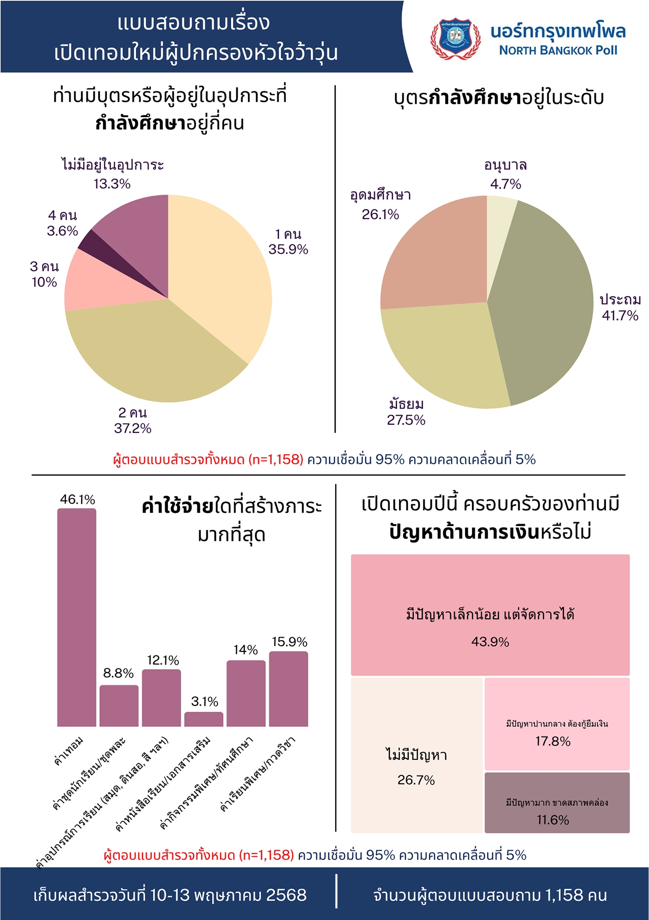 ผศ.ดร.สานิต ศิริวิศิษฐ์กุล ศูนย์สำรวจความคิดเห็น “นอร์ทกรุงเทพโพล” เปิดเผยผลจากการสำรวจความคิดเห็นของประชาชนต่อ "เปิดเทอมใหม่ผู้ปกครองหัวใจว้าวุ่น" ในวันที่ 10 – 13 พฤษภาคม 2568 จำนวนตัวอย่าง 1,158 ตัวอย่าง จากประชาชนทุกภูมิภาคทั่วประเทศ ที่ค่าความเชื่อมั่นร้อยละ 95