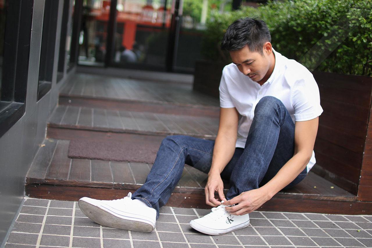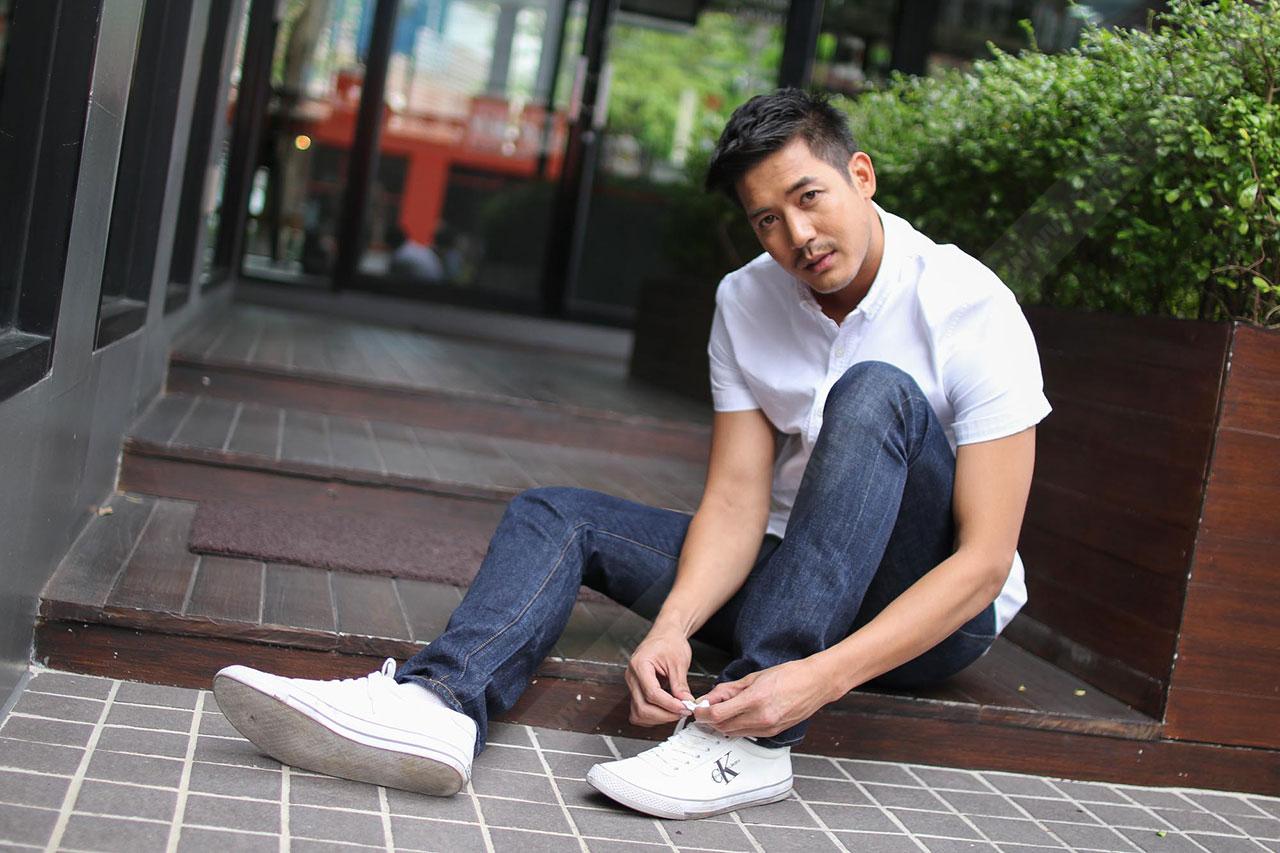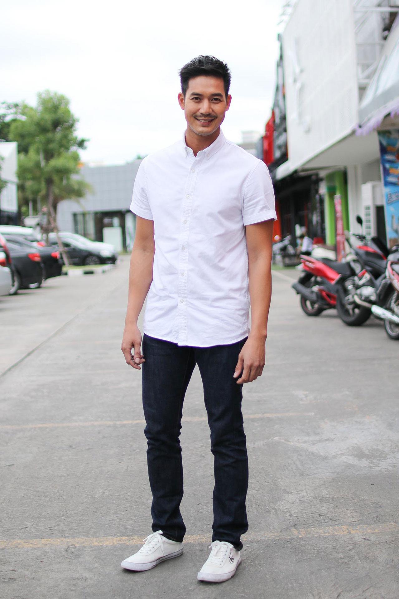 เสื้อเชิต-กางเกงยีนส์-รองเท้าผ้าใบขาว-แต่งกายด้วยองค์ประกอบง่ายธรรมดา แต่แปลกที่ว่าเราเห็นเขามาแต่ไกล,
