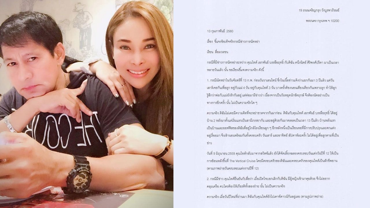 จนกระทั่งในวันนี้ 14 ก.พ. 2560 ทางด้านภรรยาของไทด์ เอกพันธ์ ซึ่ง ยุ้ย คนึงนิตย์ ได้ร่อนจดหมายถึงสื่อเพื่อชี้แจงกรณีข่าวหย่าร้างที่ออกมาก่อนหน้านี้ว่า ไม่เป็นความจริงแต่อย่างใด ตนเองและสามียังใช้ชีวิตเช่นสามีภรรยากันตามปกติ โดยในจดหมายชี้แจงมีข้อความดังนี้