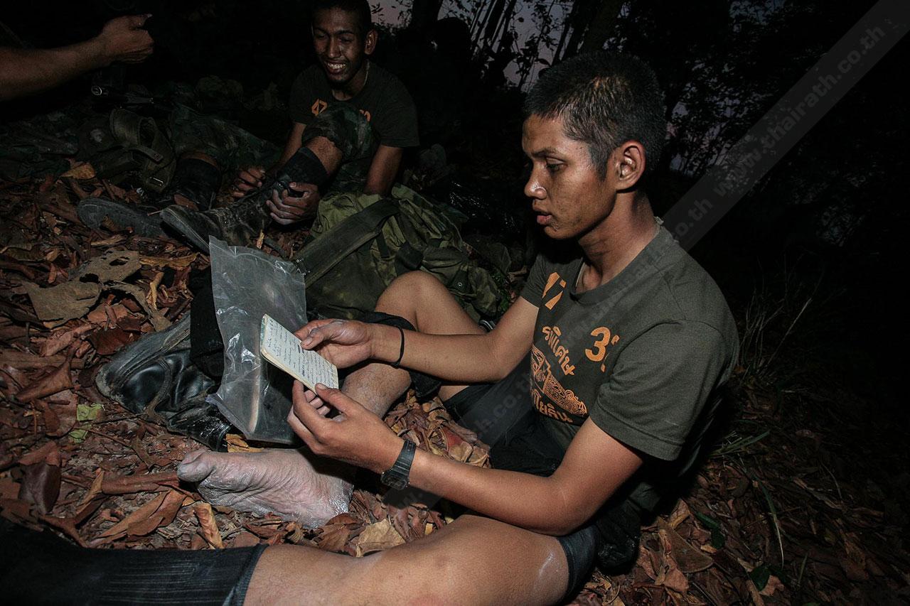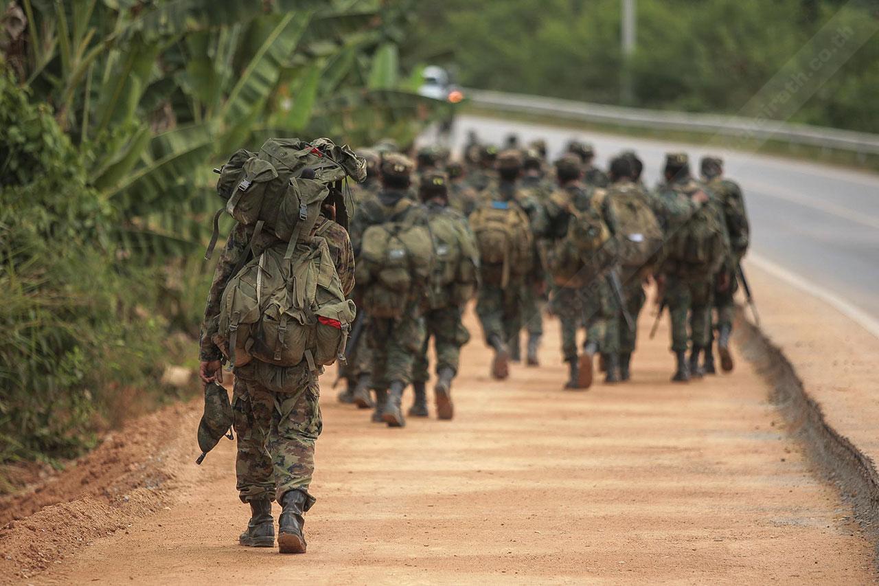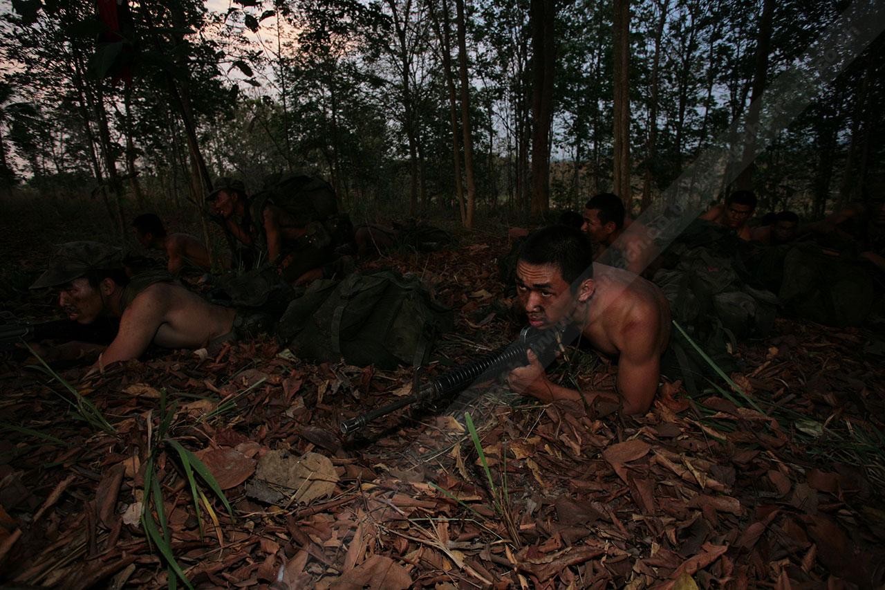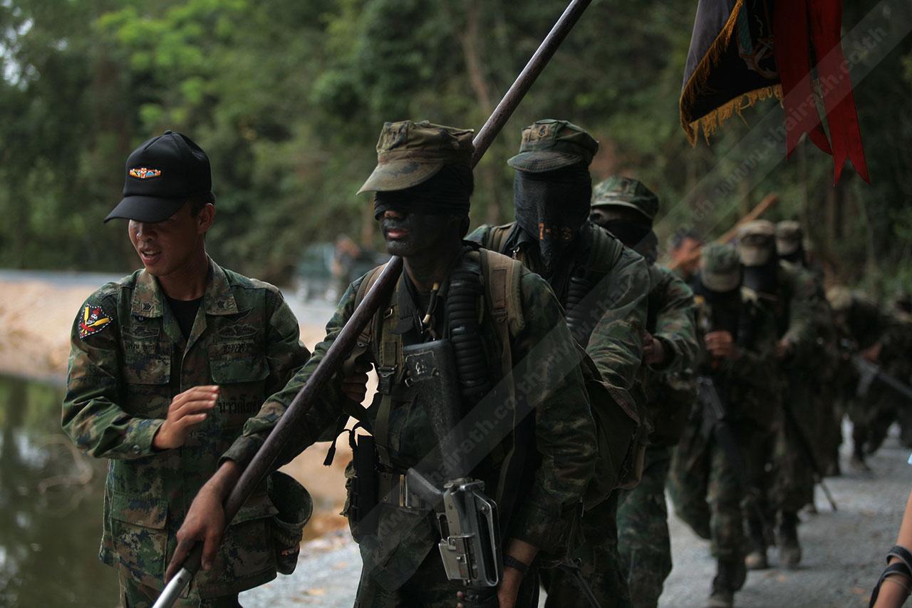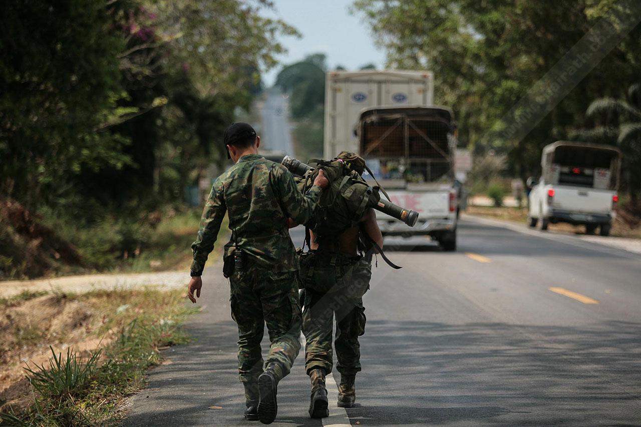 ระยะทาง 2 กม. กว่าๆ ที่เดินมายังไม่สิ้นสุดเพียงเท่านี้ พวกเขาจะต้องเดินเข้าป่าข้างทางอีกรอบ โดยระหว่างที่เดินอยู่ในป่าร่างกายแทบจะทรุดอยู่ตลอดเวลา แต่แล้วจู่ๆ เสียงระเบิดทีเอ็นทีดังสนั่น ด้วยสัญชาตินักรบที่มีอยู่ในตัว พวกเขารีบหมอบโดยพลัน ก่อนยิงสวนข้าศึกที่อยู่ข้างทางจนหนีเปิดเปิงไปกันหมด นับว่าการฝึกที่ผ่านมาทำให้พวกเขามีสติสามารถรับมือกับศัตรูที่อยู่รอบตัวได้ แม้ว่าสภาพร่างกายแทบจะล้มทั้งยืนก็ตาม