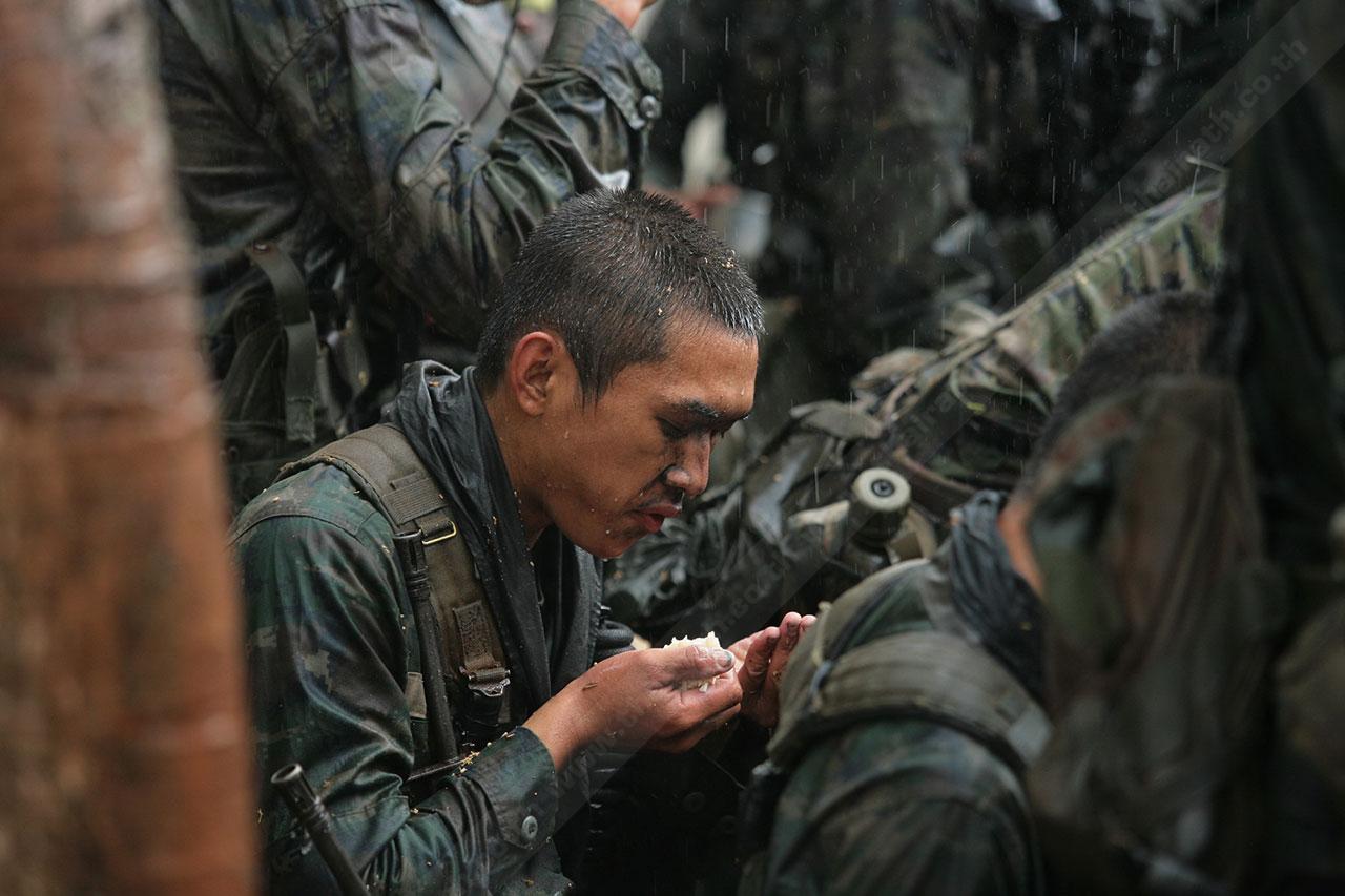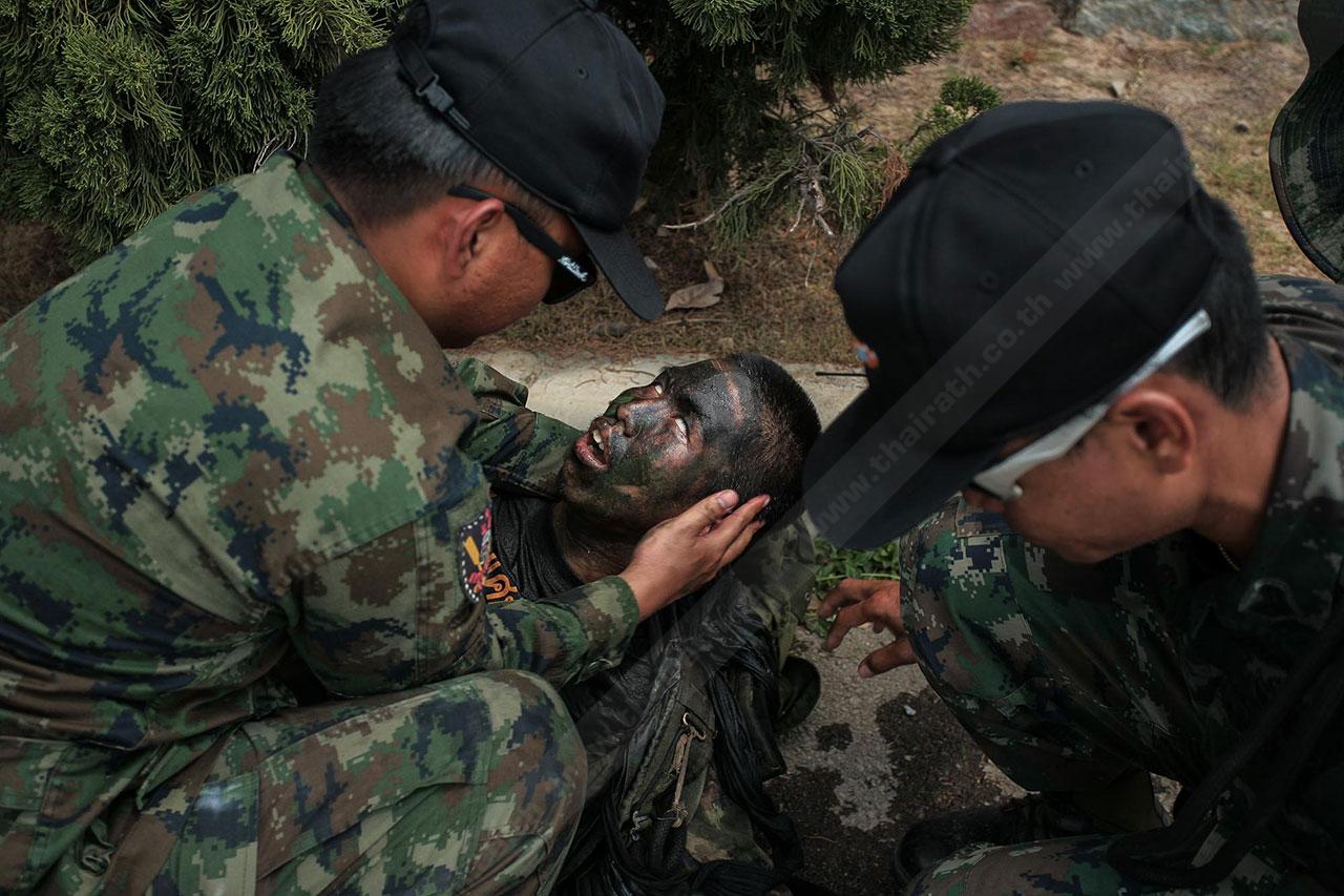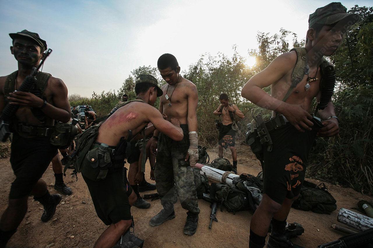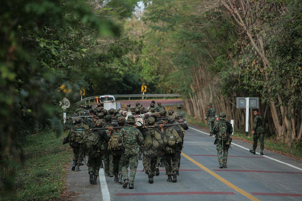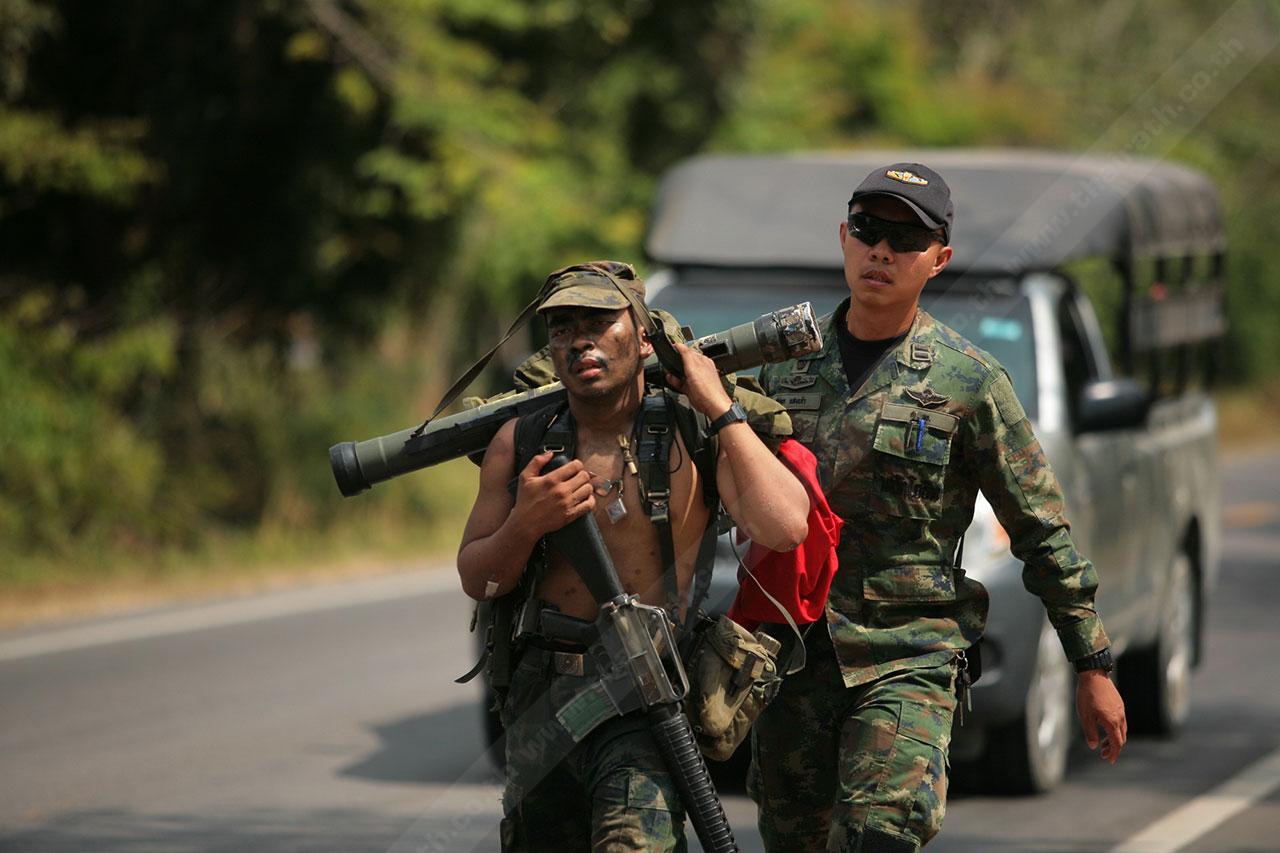 ระยะทาง 2 กม. กว่าๆ ที่เดินมายังไม่สิ้นสุดเพียงเท่านี้ พวกเขาจะต้องเดินเข้าป่าข้างทางอีกรอบ โดยระหว่างที่เดินอยู่ในป่าร่างกายแทบจะทรุดอยู่ตลอดเวลา แต่แล้วจู่ๆ เสียงระเบิดทีเอ็นทีดังสนั่น ด้วยสัญชาตินักรบที่มีอยู่ในตัว พวกเขารีบหมอบโดยพลัน ก่อนยิงสวนข้าศึกที่อยู่ข้างทางจนหนีเปิดเปิงไปกันหมด นับว่าการฝึกที่ผ่านมาทำให้พวกเขามีสติสามารถรับมือกับศัตรูที่อยู่รอบตัวได้ แม้ว่าสภาพร่างกายแทบจะล้มทั้งยืนก็ตาม