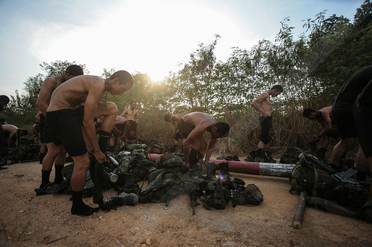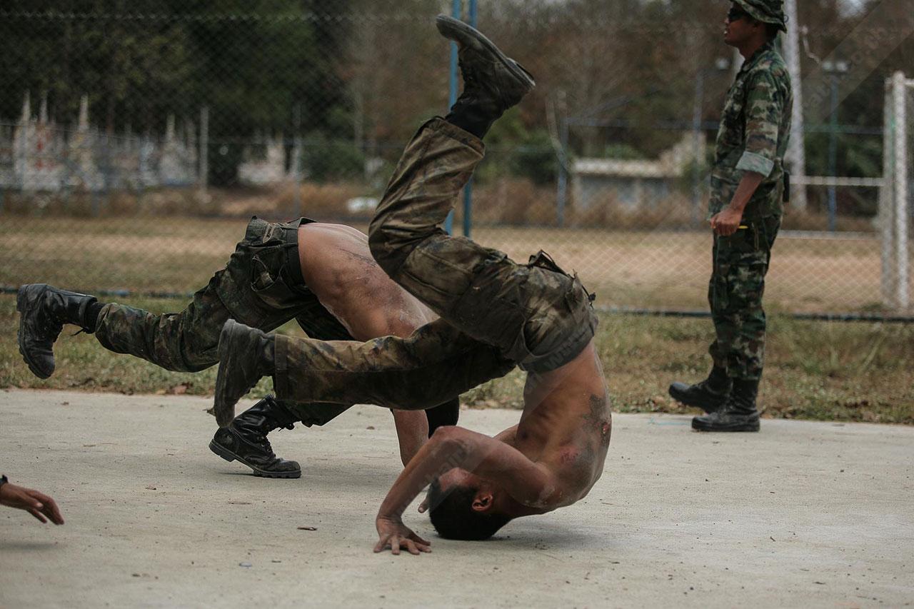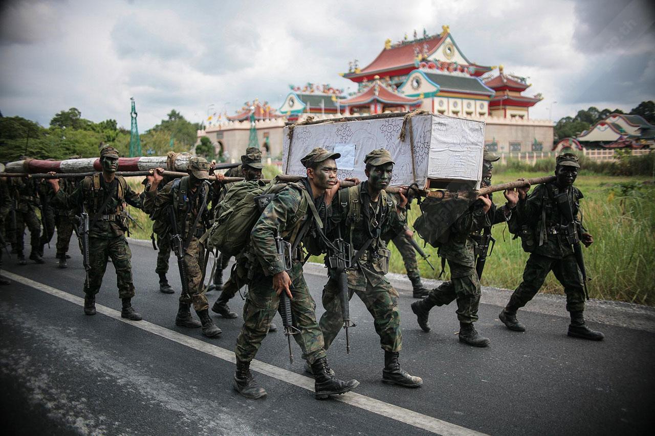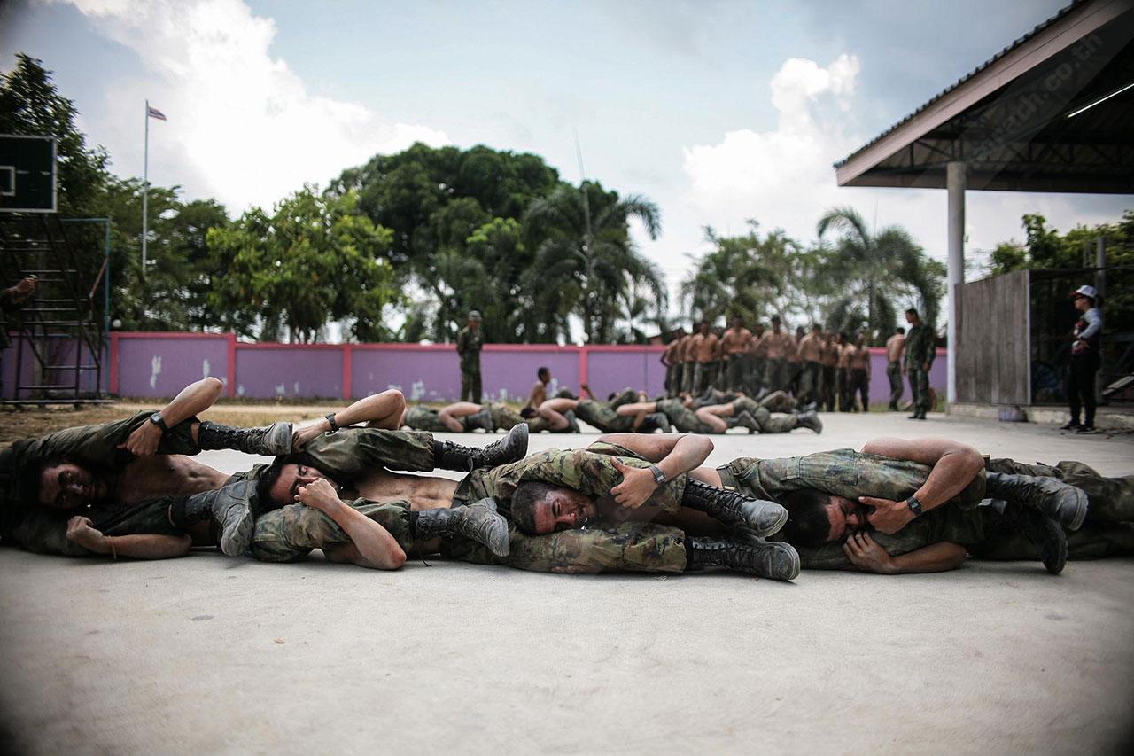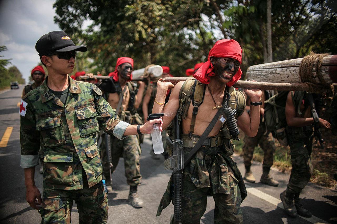 ระยะทาง 2 กม. กว่าๆ ที่เดินมายังไม่สิ้นสุดเพียงเท่านี้ พวกเขาจะต้องเดินเข้าป่าข้างทางอีกรอบ โดยระหว่างที่เดินอยู่ในป่าร่างกายแทบจะทรุดอยู่ตลอดเวลา แต่แล้วจู่ๆ เสียงระเบิดทีเอ็นทีดังสนั่น ด้วยสัญชาตินักรบที่มีอยู่ในตัว พวกเขารีบหมอบโดยพลัน ก่อนยิงสวนข้าศึกที่อยู่ข้างทางจนหนีเปิดเปิงไปกันหมด นับว่าการฝึกที่ผ่านมาทำให้พวกเขามีสติสามารถรับมือกับศัตรูที่อยู่รอบตัวได้ แม้ว่าสภาพร่างกายแทบจะล้มทั้งยืนก็ตาม