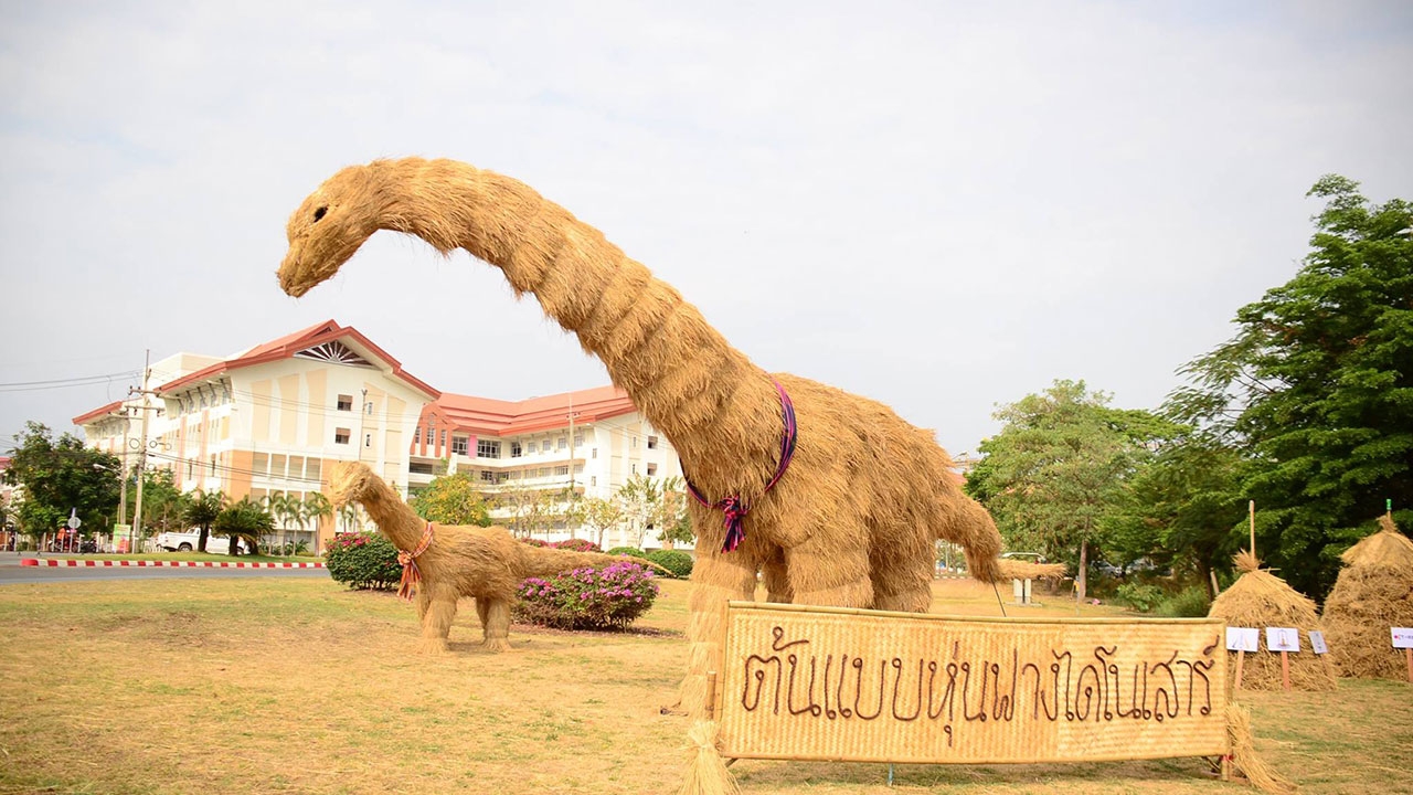 โดยหุ่นฟางไดโนเสาร์เป็นการบอกเล่าเรื่องราวของการใช้ฟาง ที่สื่อแทนความอุดมสมบูรณ์ของผืนนา อันเป็นอาชีพหลักของชาวอีสาน เป็นวัสดุในการสร้างสรรค์ประติมากรรมไดโนเสาร์ขนาดยักษ์นี้ ซึ่งเกิดขึ้นภายใต้โครงการต้นแบบหุ่นฟางไดโนเสาร์ ย้อนรอยเรื่องราวดินแดนอู่ข้าวอู่น้ำ โดยได้รับการสนับสนุนจากโครงการหนึ่งคณะหนึ่งศิลปวัฒนธรรม มหาวิทยาลัยมหาสารคามใช้เวลาดำเนินการตั้งแต่เดือนธันวาคม 2559 ถึงมีนาคม 2560 รวมระยะเวลา 3 เดือน ทั้งนี้ผู้ที่สนใจสามารถชมต้นแบบหุ่นฟางไดโนเสาร์ไทยได้ที่ บริเวณสนามหญ้าทางไปหน้ามหาวิทยาลัยมหาสารคาม ซึ่งจะจัดแสดงให้ชมเป็นเวลา 1 เดือน โดยภายในงานมีการจัดแสดงนิทรรศการวิธีและขั้นตอนการทำหุ่นฟางไดโนเสาร์ และนิทรรศการแหล่งเรียนรู้ฟอสซิลไดโนเสาร์ ที่ศูนย์วิจัยและการศึกษาบรรพชีวินวิทยา มหาวิทยาลัยมหาสารคาม.