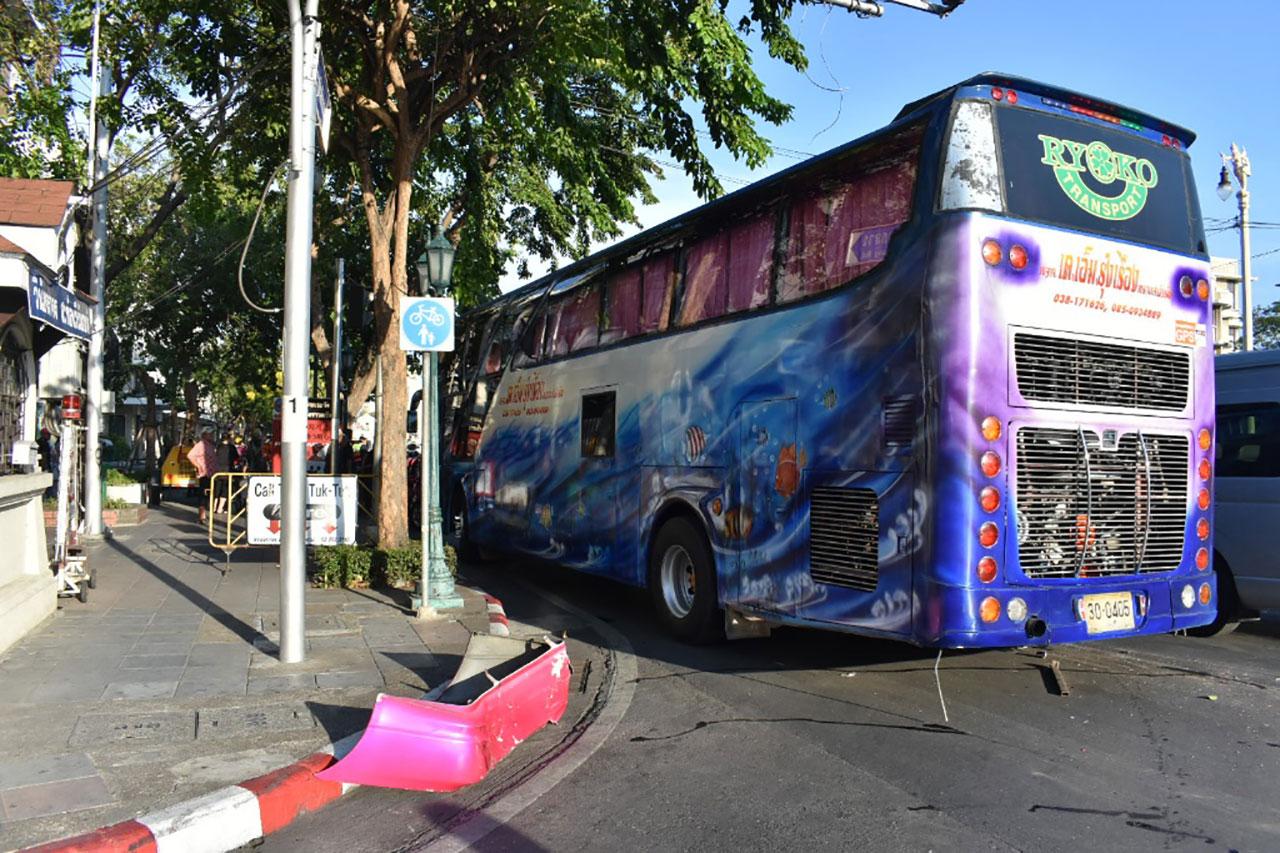 สอบสวนนายพัฒนะ วรรณกิจ อายุ 32 ปี ผู้ขับรถทัวร์คันเกิดเหตุ กล่าวว่า เมื่อช่วงเช้า ส่งลูกทัวร์ชาวจีน 28 คน มาเที่ยววัดพระแก้ว และไปจอดรอใต้สะพานพระราม 8 จากนั้นก่อนเกิดเหตุจึงวนจะไปรับลูกทัวร์หน้าโรงแรมรัตนโกสินทร์ แต่ขณะขับมาถึงใกล้จุดเกิดเหตุซึ่งเป็นทางเลี้ยว ได้เหยียบเบรก แต่ได้ยินเสียงดัง "กึก" จึงพยายามปลดเกียร์เพื่อให้รถชะลอ แต่ไม่เป็นผล ประกอบกับด้านหน้ามีรถจอดเป็นจำนวนมาก จึงตัดสินใจขับออกเลนซ้าย จนพุ่งชนรถที่จอดอยู่ได้รับความเสียหาย เบื้องต้นเจ้าหน้าที่แจ้งข้อหาขับรถโดยประมาทเป็นเหตุให้ทรัพย์สินเสียหายต่อไป.