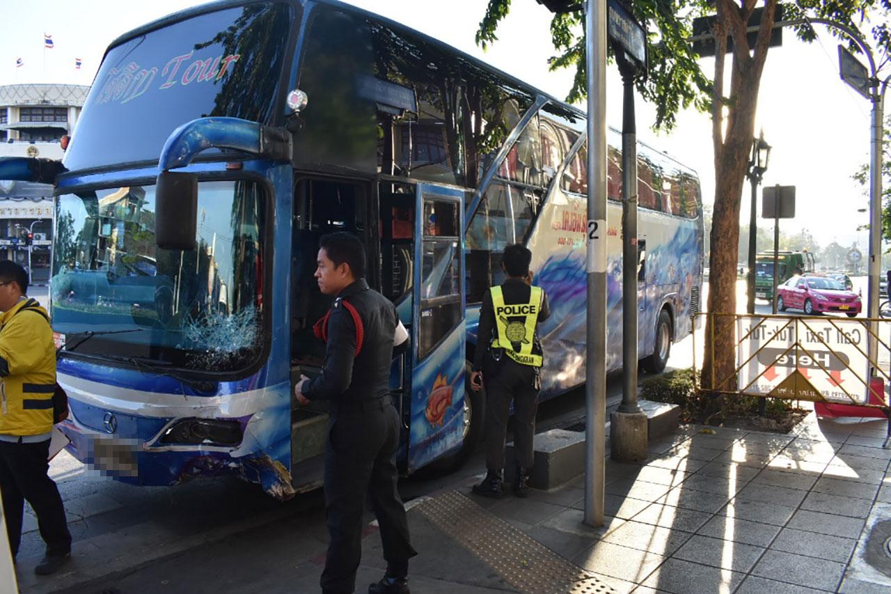 เมื่อเวลา 17.00 น. วันที่ 19 มี.ค.60 ร.ต.อ.รัฐกานต์ ทองไทย รอง สว.(สอบสวน) สน.ชนะสงคราม รับแจ้งอุบัติเหตุรถทัวร์เบรกแตกพุ่งชนรถยนต์หลายคัน และมีผู้บาดเจ็บ บริเวณสี่แยกคอกวัว ถนนราชดำเนินกลาง ขาเข้า มุ่งหน้าอนุสาวรีย์ประชาธิปไตย แขวงบวรนิเวศ เขตพระนคร กทม.