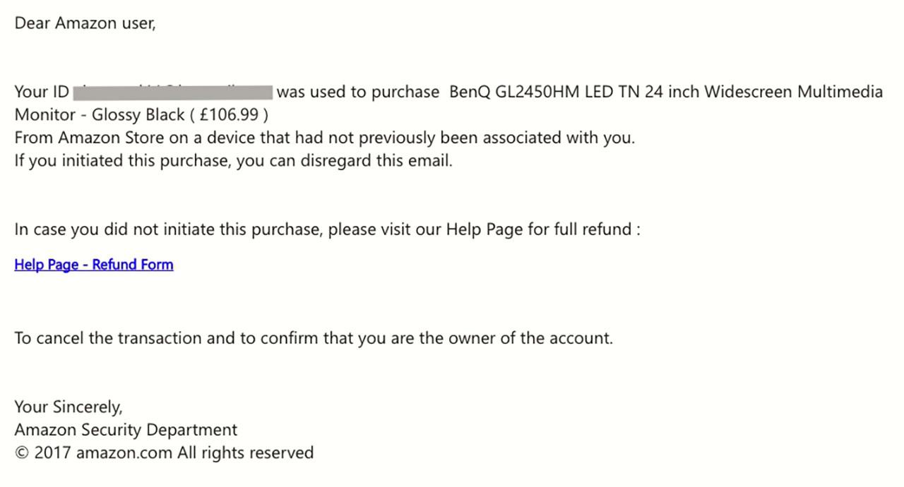 สรุปง่ายๆ ก็คือเว็บไซต์ Amazon ซึ่งเป็นเว็บไซต์ซื้อขายสินค้าที่มีผู้ใช้งานมากมายส่งอีเมลมาบอกเฟื่องว่า มีคนนำ Account ของเฟื่องไปใช้ซื้อคอมพิวเตอร์จากประเทศอังกฤษในราคาแพง ซึ่งทางเว็บไซต์ตรวจสอบว่าไม่ตรงกับพฤติกรรมการซื้อปกติของเฟื่อง ดังนั้นหากเฟื่องไม่ได้ซื้อสินค้าดังกล่าวให้กดลิงก์ด้านล่างโดยด่วน