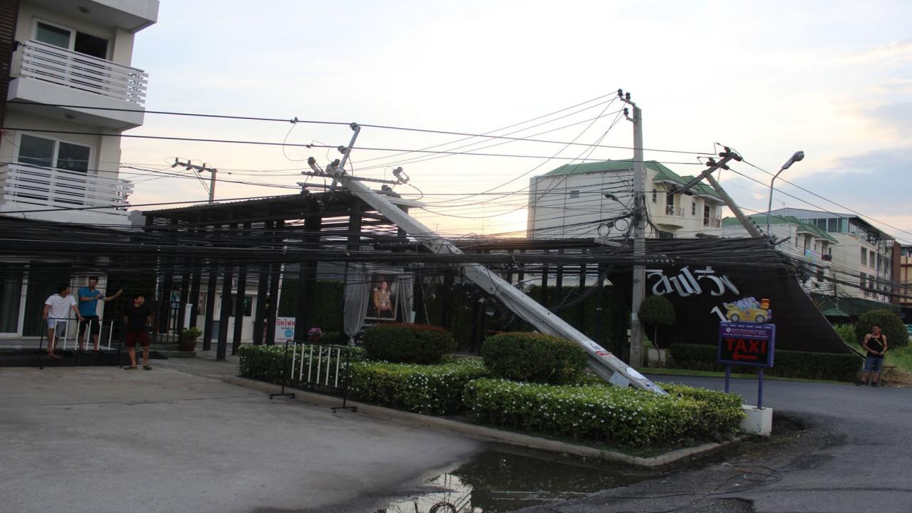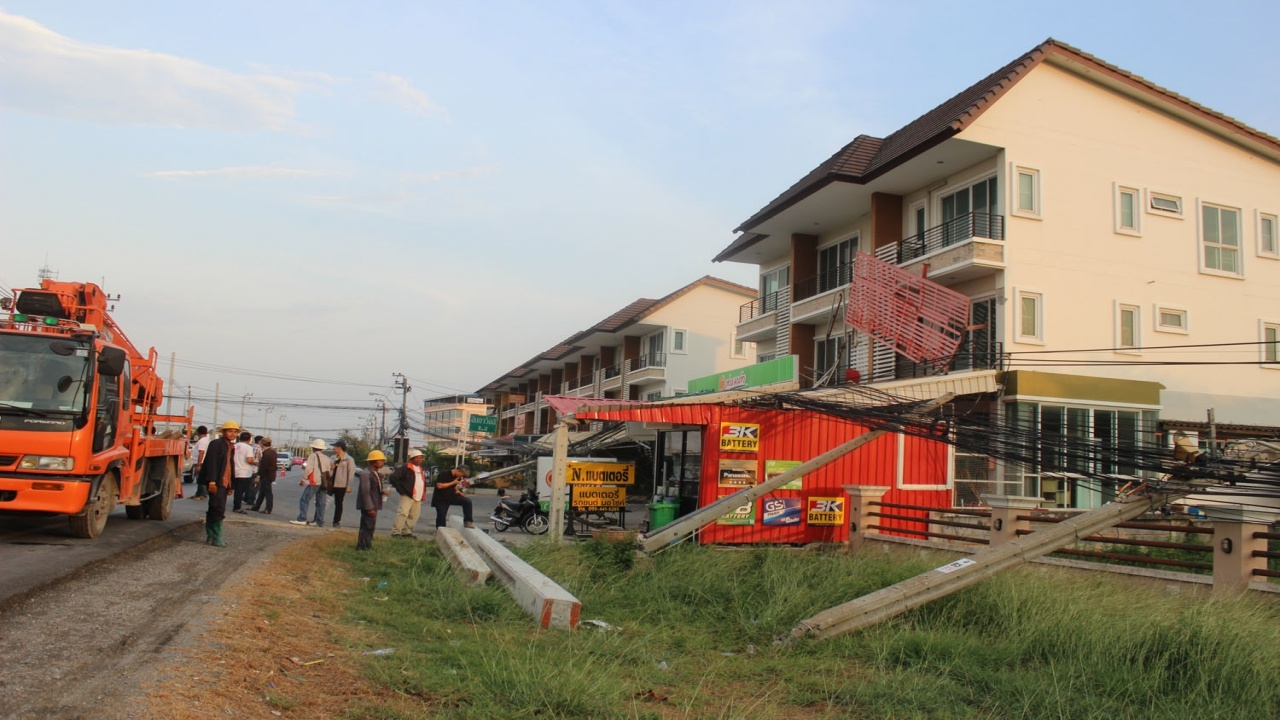 เมื่อถึงที่เกิดเหตุ พบเสาไฟฟ้าล้ม ตั้งแต่หน้าหมู่บ้านหมู่บ้านลัดดาวิลล์ 1 หมู่บ้านศิลปการพาร์ค โครงการ 5 และหมู่บ้านลิฟวิ่ง 1 ความยาว กว่า 500 เมตร มีเสาไฟฟ้าล้ม จำนวน 9 ต้น มีกันสาดของตึกแถวได้รับความเสียหายจำนวนหลายหลัง รวมถึงรถยนต์ที่จอดอยู่ด้านหน้าอาคาร ได้รับความเสียหาย แต่ไม่มาก หน้าหมู่บ้านศิลปการพาร์ค โครงการ 5 รถไม่สามารถเข้าออกได้ เนื่องจากมีสายไฟฟ้า และสายโทรศัพท์ขวางทางอยู่ ส่วนหน้าหมู่บ้านเดอะ ลิฟวิ่ง 1 ป้ายหมู่บ้านหล่นลงมา