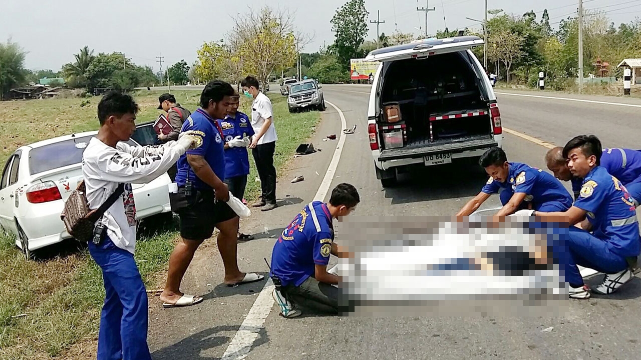 2 ผัวเมียเจ้าของร้านขายก๋วยเตี๋ยวที่เมืองกาญจน์ ควบจยย.จะไปโรบินสัน เกิดอุบัติเหตุชนประสานเก๋ง บริเวณทางโค้งหน้าวัดเขาพิมปรีชาราม อ.ท่าม่วง ดับคู่ ขณะที่คนขับเก๋งคู่กรณีทิ้งรถเผ่นหนี ตร.เร่งตามตัวสอบปากคำ